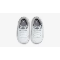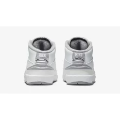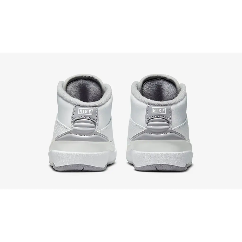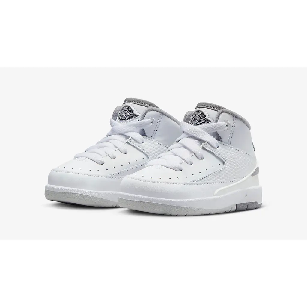 This toddler-sized AJ2 has a durable pristine white upper made of real leather, synthetic leather, and textile materials. The mid-panel accents show off the silhouette’s signature faux reptilian finish. Cement grey joins the mix via the Wings logo embossed on the tongues, the tongue lining, the plush sock liner and the Nike-branded heel panel. A white midsole and a sail and cement grey rubber outsole complete the design of this shoe.