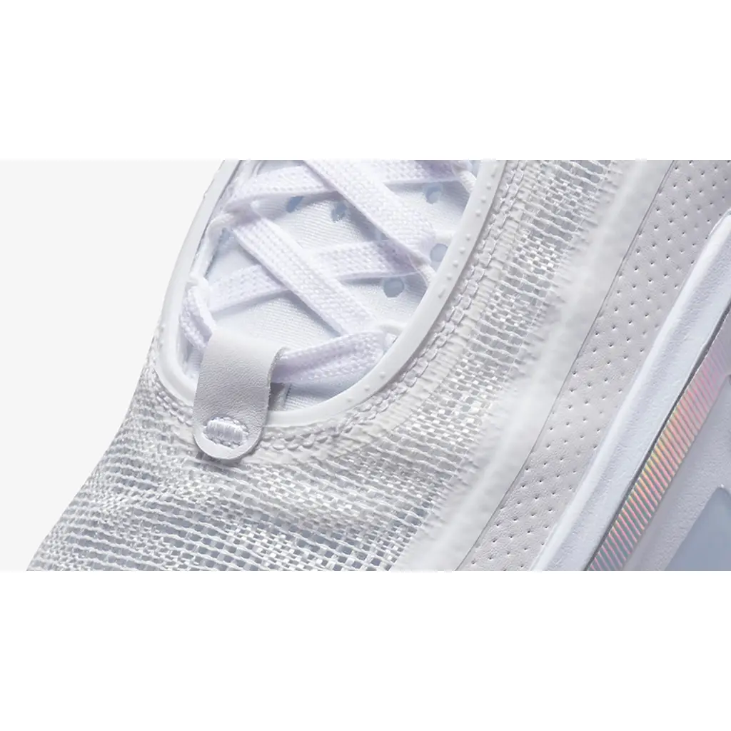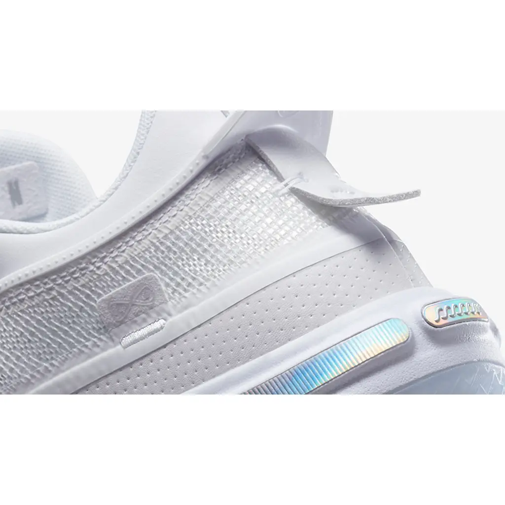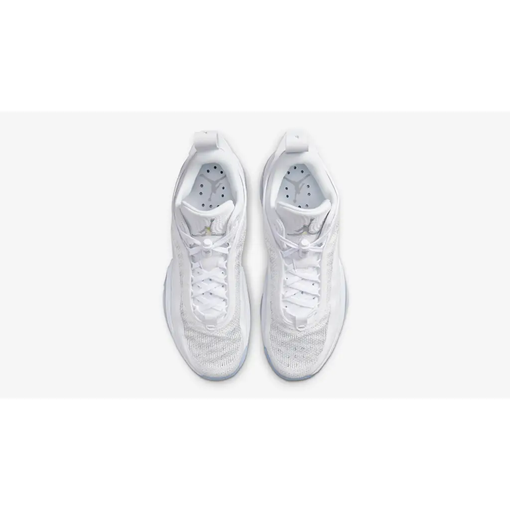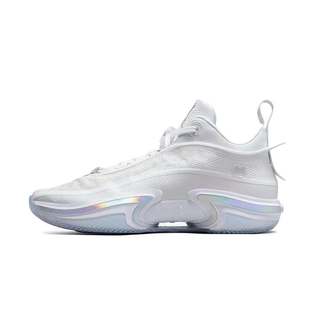 This AJ36 has a luxe-looking gauze-like Jacquard Leno-Weave upper in white held in place by a TPU ribbon. White repeats on the laces, lace locks and extra-large heel pull tabs. An eye-catching iridescent silver strip embellishes the bottom section of the upper, matching the Jumpman branding on the oversized white tongue. The midsole is reinforced with a full-length Zoom Air Strobel unit and a Zoom Air unit below the forefoot. An icy translucent rubber outsole completes the style of these kicks.