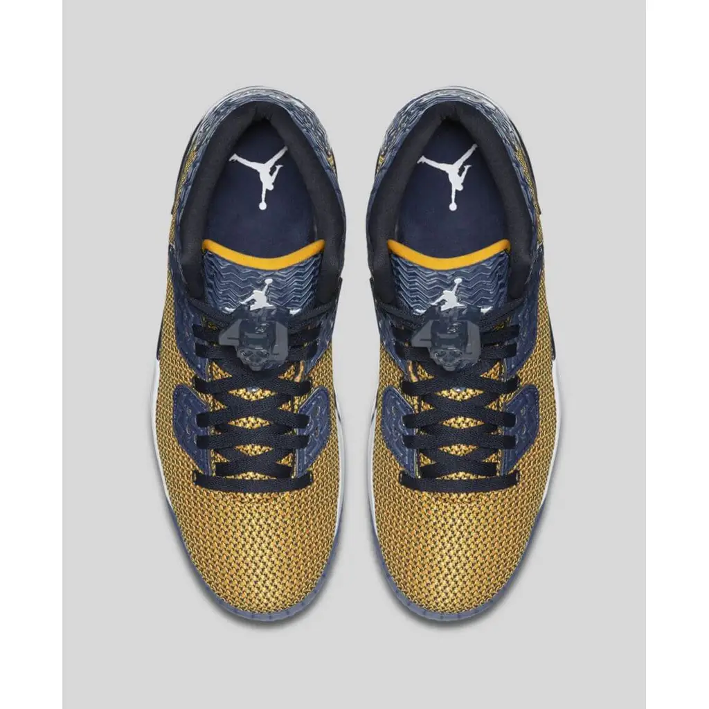 This edition of the Jordan Spike Forty is dressed in a mix of Gold Leaf and Midnight Navy colourway. The pair is crafted with textile and molded TPU based upper in gold inspired colour. It includes additional details on the lace tips and tongue and also features reflective material and a lace toggle in contrasting midnight navy shade. The pair sits on top of a Phylon midsole with a zoom air heel unit offering additional comfort. The look is finished off with a clear outsole.