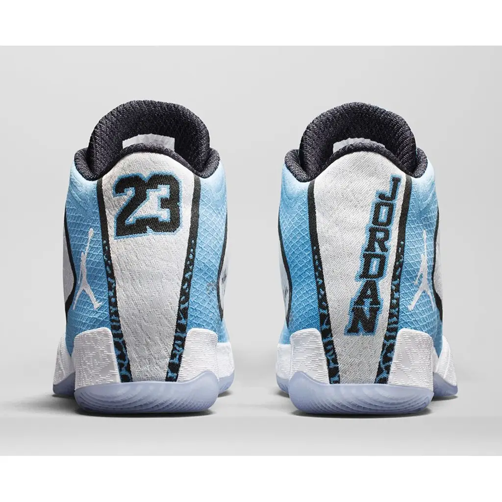 The Air Jordan XX9 pairs are the lightest Air Jordans available. It is designed with a re-engineered flight plate and one-piece woven upper that allows out feet to moves naturally and comfortably. This newest colourway of the AJ XX9 features legend blue and white separated with bold black lines that stand out on the upper. It also features elephant print on the mid-sole while a bold 23 and JORDAN branding is seen on the heel region.