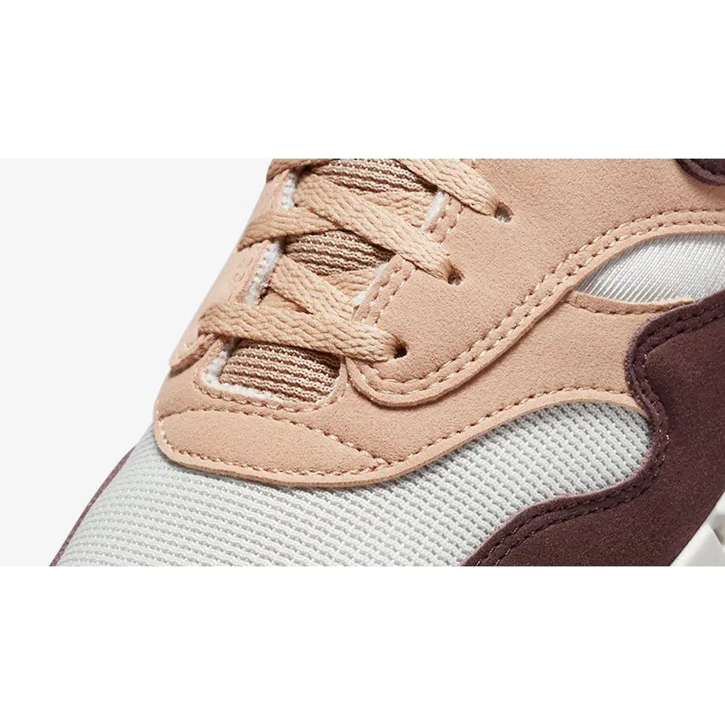Similar to the βSmokey Mauveβ edition that is also part of the capsule, the βMetallic Gold Grainβ opts for a selection of brown hues, here in a similar arrangement to the AM1 βAmsterdamβ from 2020. The darker shade of brown tracks along the mudguard, up onto the Swoosh and the outsole below. Other overlay sections are cut from a tan suede, with a set of matching flat laces threaded onto the upper. Breaking up the palette is a traditional white midsole and mesh, with the retro nylon ankle collar a specific design choice for the Big Bubble comeback.