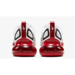 White neoprene covers the top of this red Air Max 720, in the original style, decorated with debossed waves that the silhouette is so famous for. Topped off with gradient red geometric shapes on the sidewalls and towards the heel.