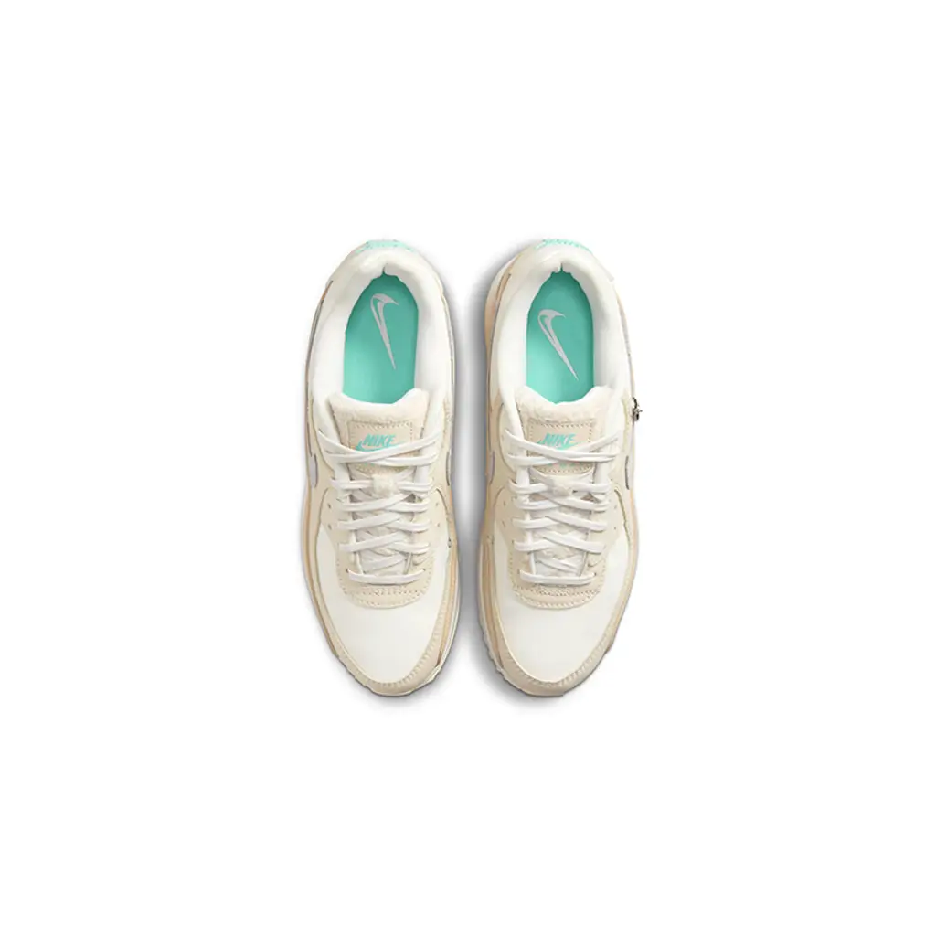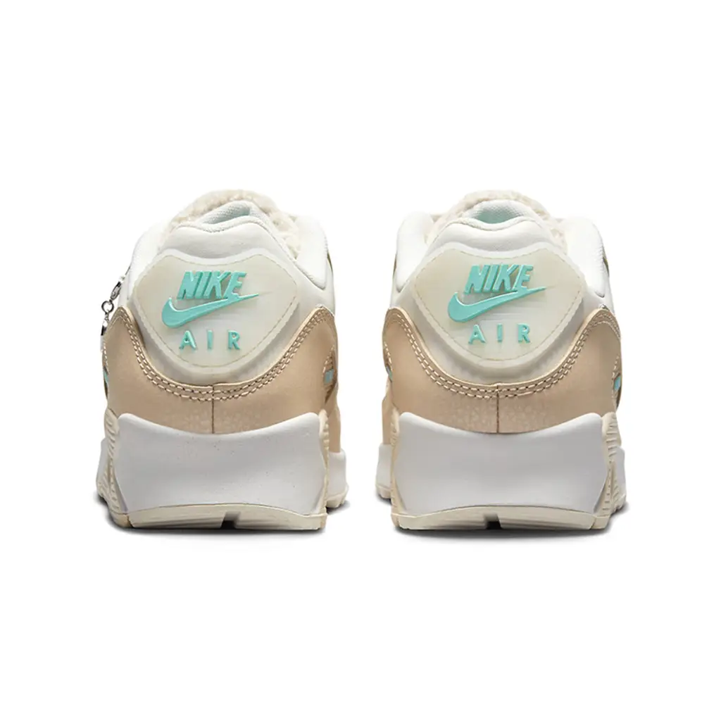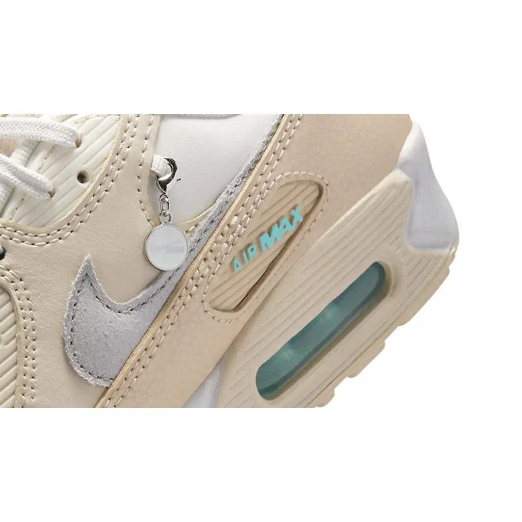 This Air Max 90 has a smooth white leather base. The first wraparound overlay is off-white smooth leather, matching the ribbed TPU eye stay accents, while the second mudguard layer on both sides of the shoe is cream-coloured tumbled leather. The cracked leather profile Swooshes on the medial and lateral mid-panels are a soft complementary grey. Baby blue joins the mix on the Nike branding on the woolly white tongues, the Air Max cutout windows near the lateral collars, the heel tab Nike Air branding and the mesh insoles showing off white Swooshes. The removable silver charm hanging from the lateral collar features the grey text “MAMA” together with a mini grey Swoosh. A moulded white midsole with exposed Air units at the heel and a cream-hued rubber outsole cap off the design of this shoe.
