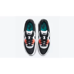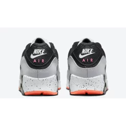 Boasting a stealthy colour arrangement of black that adorns the mesh underlays and profile Swooshes, the design of this AM90 is heavily contrasted with pristine white tones wrapped around the midfoot leather panels, Turf Orange on the TPU eyestays and mini logo window, and grey across the sidewall mudguard.