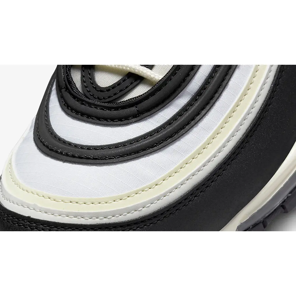 One of Nike’s well-loved sneakers arrives in a sophisticated monochromatic colourway. Introducing, the Nike Air Max 97 Black Sail! Starting with a white textile base, it’s decorated with black and cream ripples.