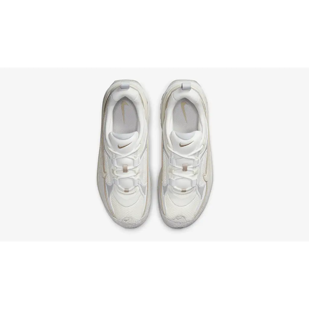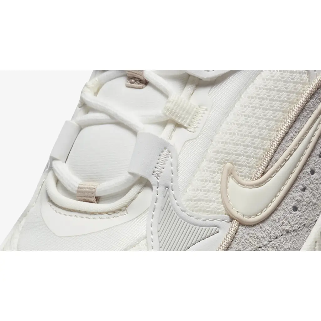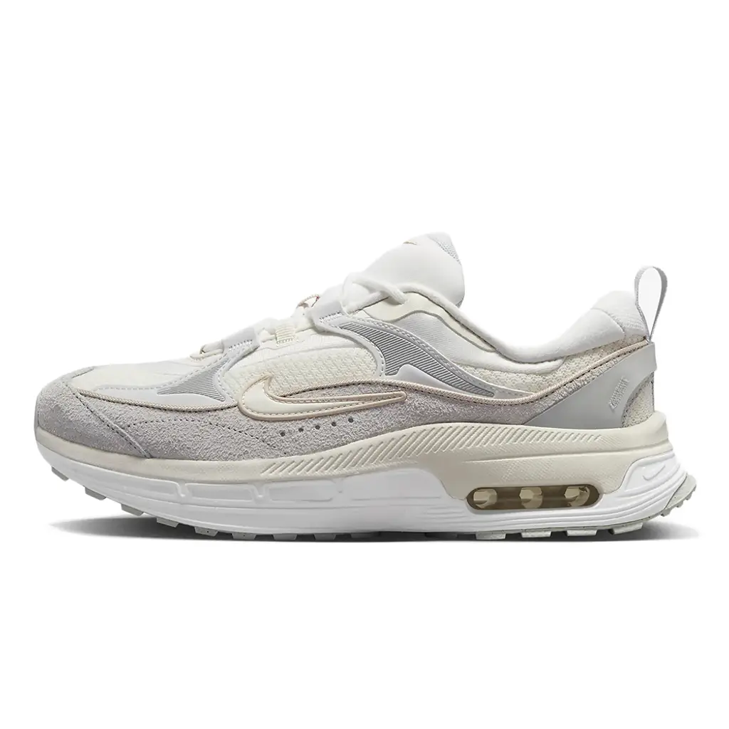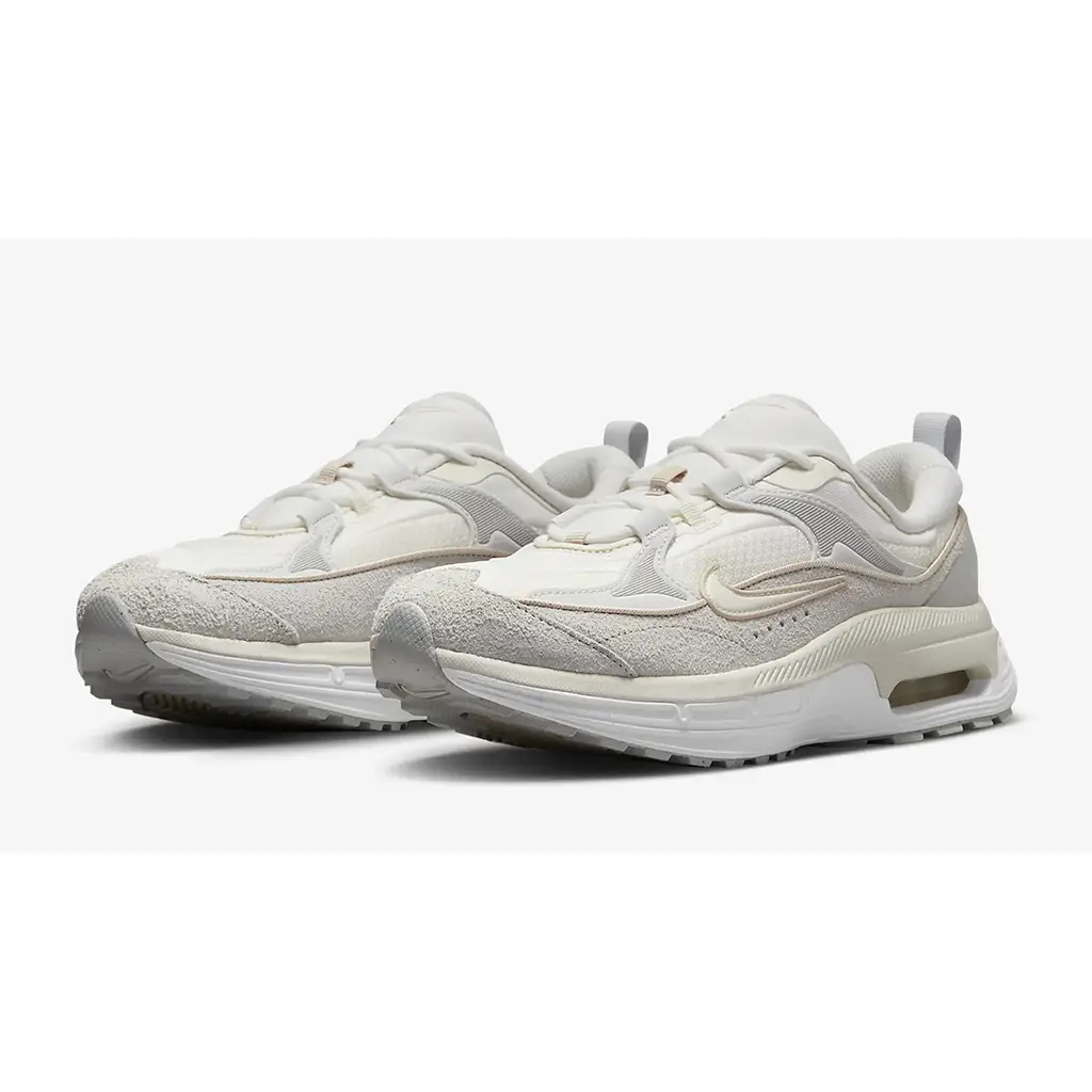 This Air Max Bliss LX has a summit white mesh base and photon dust suede overlays on the toe cap, the wraparound mudguard and the synthetic material eye stay accents. The signature profile Swooshes on both the medial and lateral mid-panels are in summit white outlined in sand drift beige. The pillowy summit white collar adds comfort to every step and the low-cut design gives the shoe a sleek and sporty look. A sail and summit white midsole with exposed Air units at the heel and a summit white and sand drift rubber outsole wrap up the look of this shoe.