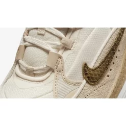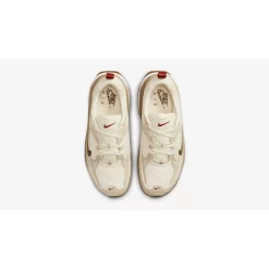 The Nike Air Max Bliss SE Pale Ivory convinces with its cool layered design and stylish looks. The upper begins with an ivory fabric base that’s overlaid with strips of beige leather. Velvety suede picks up the earthy hue and lands on the toe and mudguard. Edge comes in via the Swoosh motif which is rendered in faux snakeskin, pointing to the style’s desert inspirations. The Swoosh embroidery on the tongue introduces a hit of red that’s subtly picked up again by the exposed Air unit along the lateral midsole. Finally, the laces are traced with reflector stripes for visibility in the dark.
