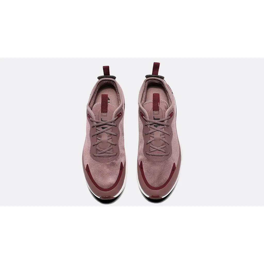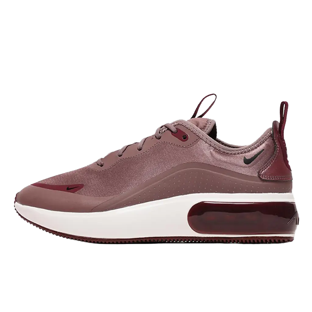 Warm burgundy tones take over this plum Air Max Dia, dressed in a silky material across the upper that shimmers in the light. A glossy burgundy heel panel decorates the back of the shoe, matching the small details on the lace unit and to box. The sleek shape of the sneaker is built with the female foot in mind with a slightly pointed toe that looks streamlined and sophisticated.