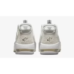 This Air Max Penny 1’s base is white tumbled leather. The overlays are in a hairy greyish-white suede. The jelly Swoosh on the lateral side of the shoe is in Anthracite black with silver line patterns. The white heel pull tab and tongue tab also have a strip of black in the middle. The mini Swoosh on the toe box window is a very light peach. A white and cream sole unit enhanced by an exposed Air unit at the heel finishes off the style of this shoe.