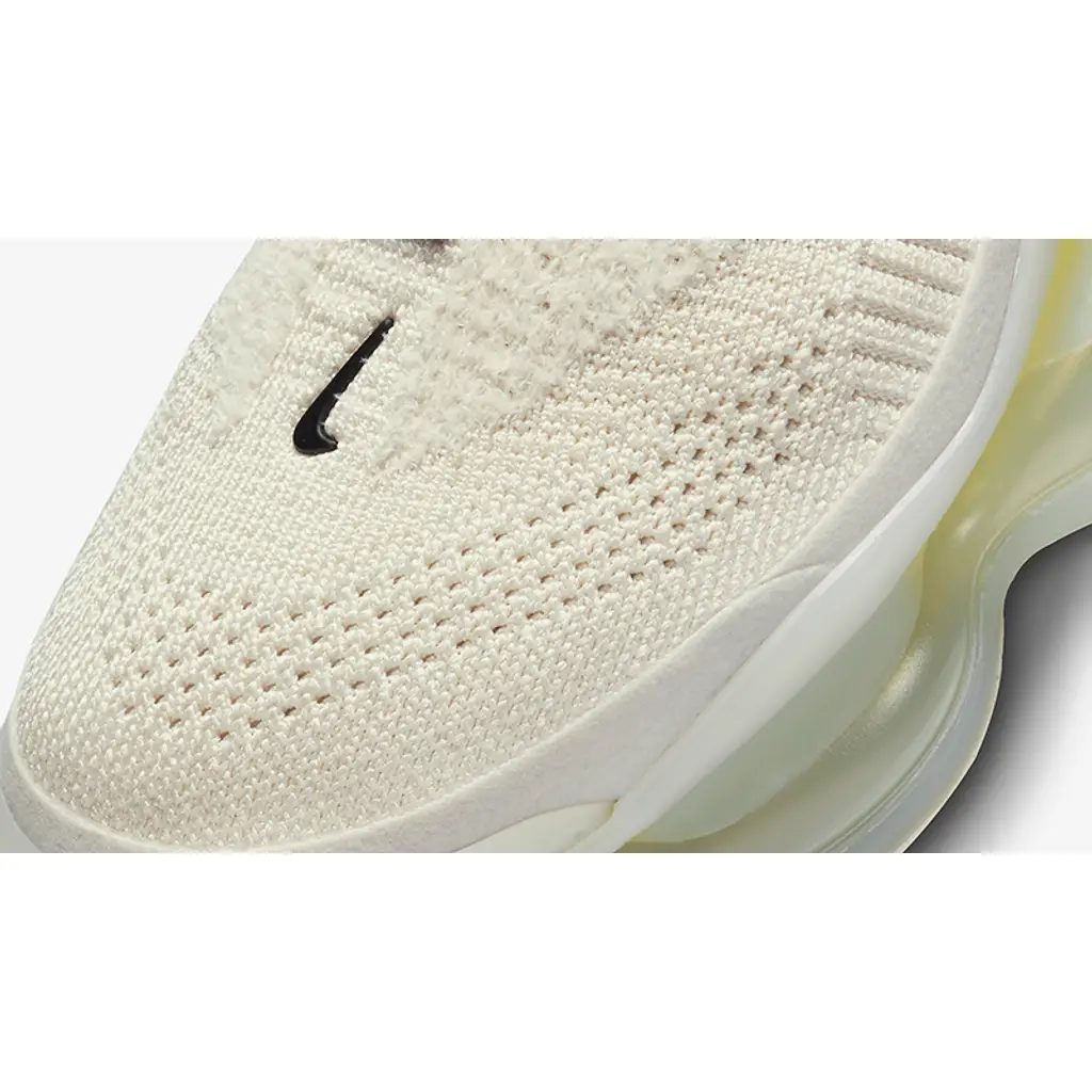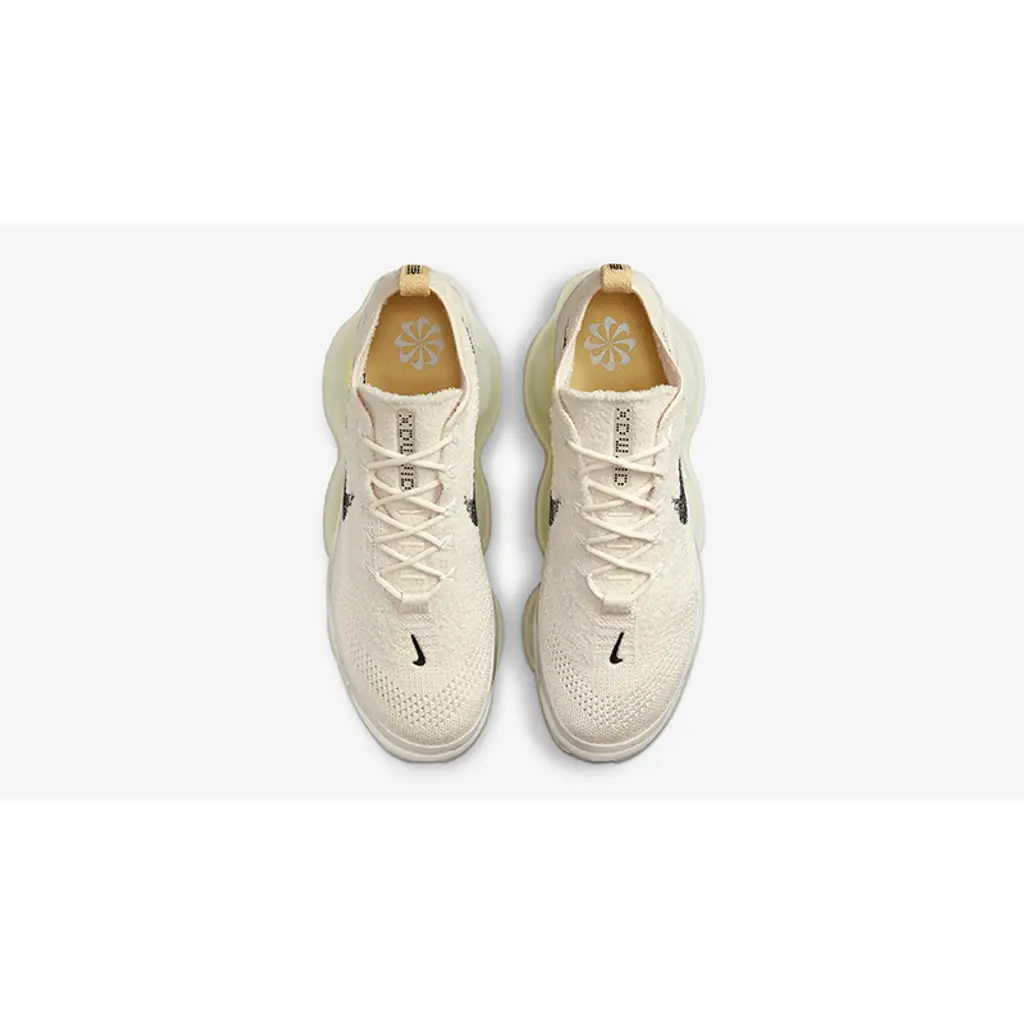 This Air Max Scorpion has a Flyknit upper in creamy Beige that’s influenced by the Air VaporMax’s Flyknit. The medial and lateral black profile Swooshes are woven into the design. A matching Light Cream mudguard wraps around the bottom of the upper. The peach heel tabs feature a stylised dotted Nike text branding and match the peach insoles featuring Nike’s Pinwheel logo that signifies that the shoe is part of its “Move to Zero” sustainability program. The highlight of this shoe, though, is the chunky Max Air midsole with hits of Yellow Strike. Semi-translucent icy white podded rubber outsoles finishes off the look of this shoe.