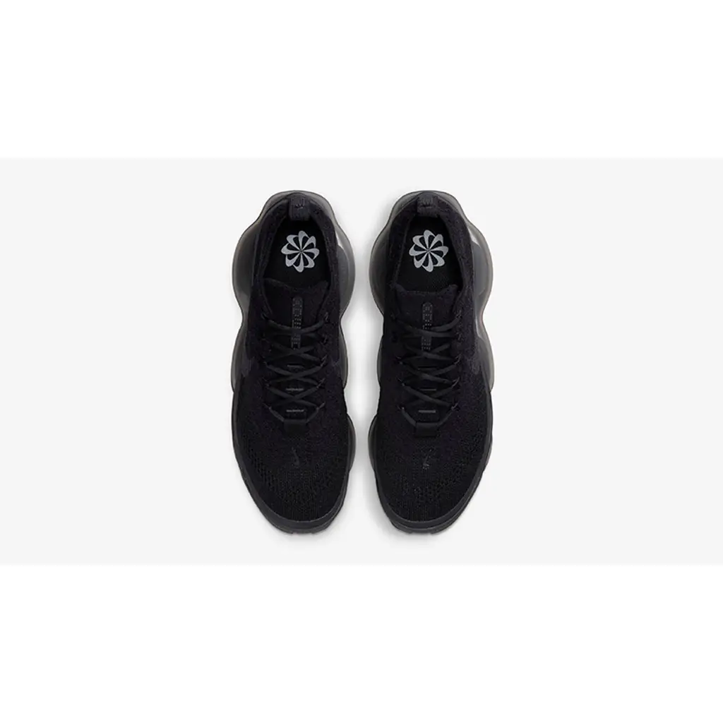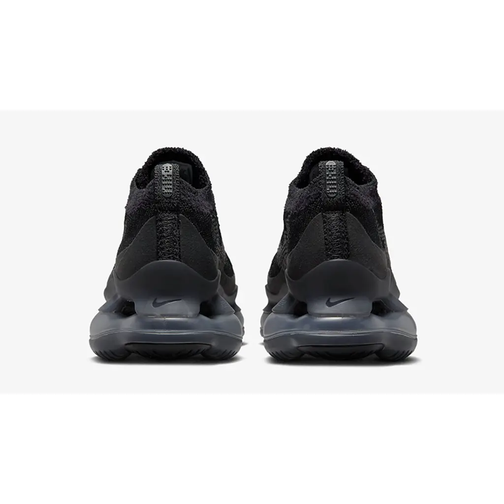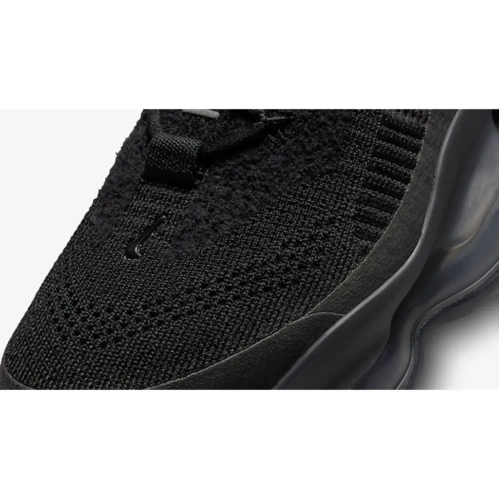 The blacked-out and newly developed Flyknit chenille upper provides a balance to the aggressive midsole below via its sleek silhouette. The branding on the shoe is understated, with two dark grey swooshes being weaved into the Flyknit upper and a mini-Swoosh on the heel portion of the midsole.