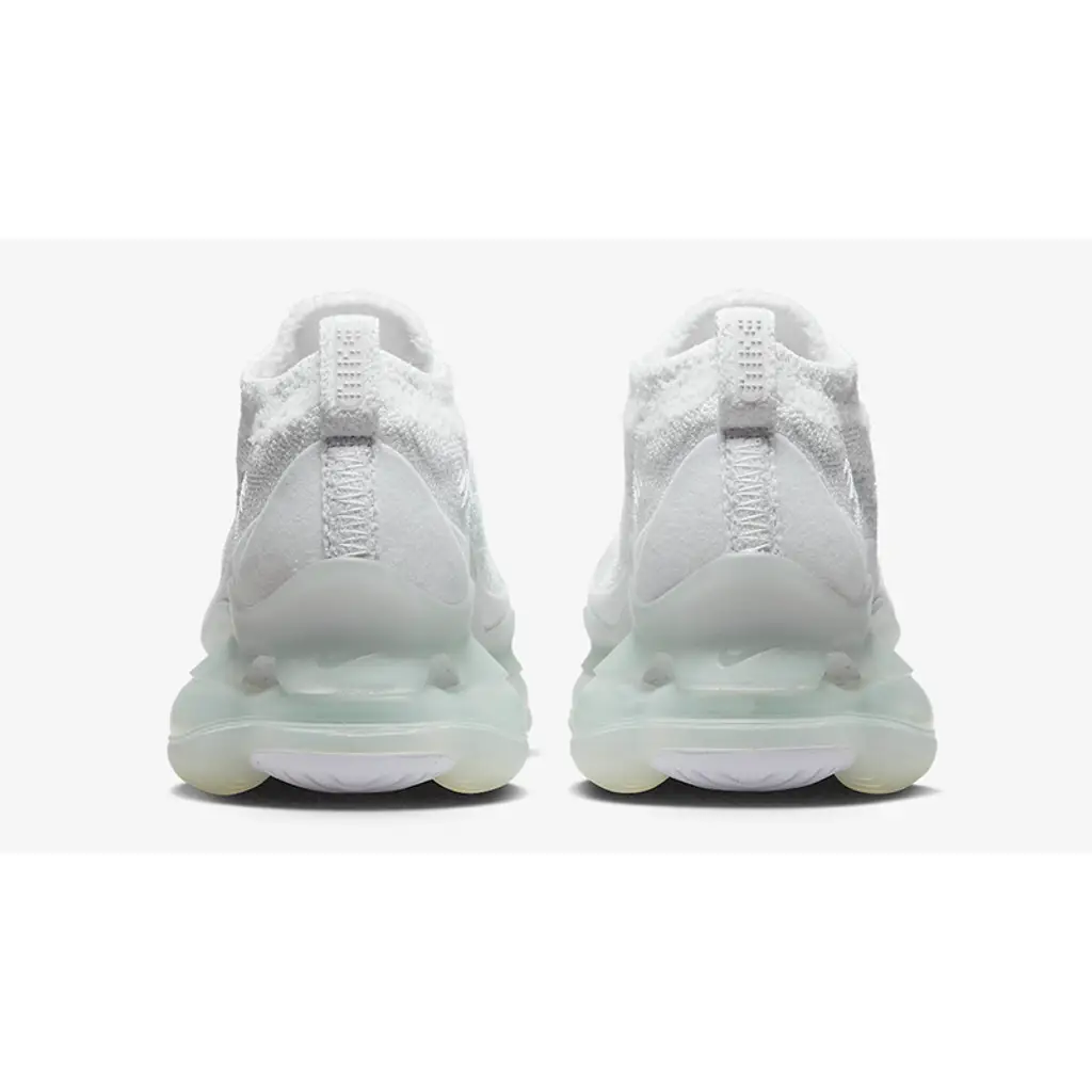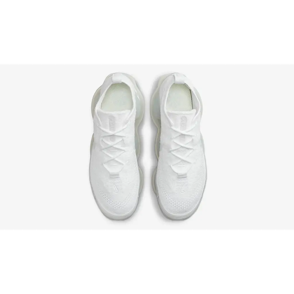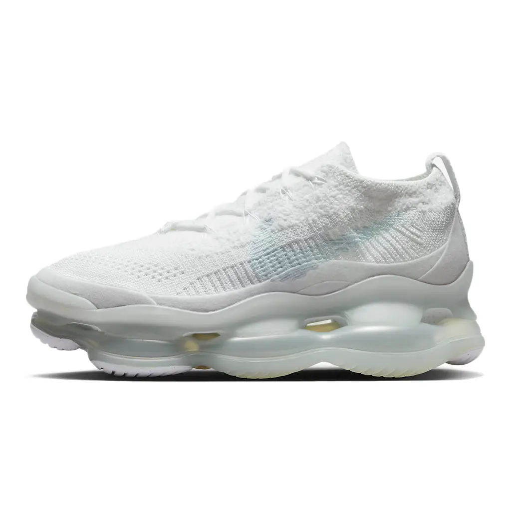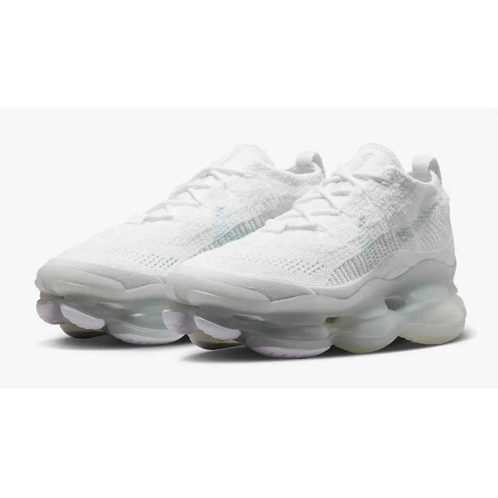 This AM Scorpion is dressed in its iconic first-of-its-kind Flyknit chenille upper with a clean white colour and a comfy sock-like fit. Stylized, barely-there signature profile Swooshes in pale mint are printed across the mid-panels. A white synthetic felt-like fabric mudguard wraps around the entire bottom of the shoe. The Pinwheel logos on the white insoles indicate that this shoe is made from sustainable materials and is part of the brand’s “Move to Zero” campaign. The wavy sole unit featuring a pearlised, semi-translucent finish and full-length signature Air bags caps off the look of these kicks.