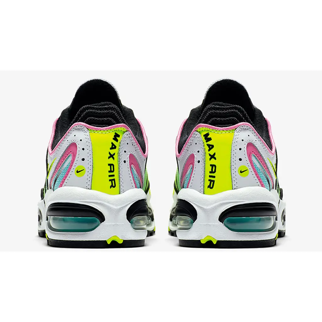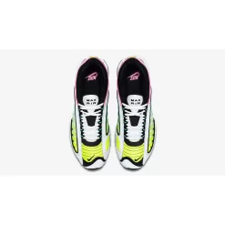 A breathable mesh covers the base layer of the Multicoloured Neon Nike Tailwind 4, in a gradient style, converting from neon yellow at the front of the sneaker towards a blue hue at the heel. On top of this, white leather is piped with pink seams, which wrap around the heel of the silhouette, while black seams follow around the rest of the shoe.
