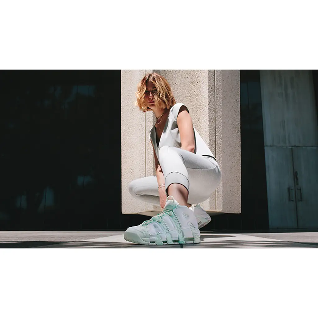 The Air More Uptempo is characterised by the oversized branding which hits the sidewall – a feature synonymous with 90s era footwear. The light shade of green against the premium leather upper is complimented by hits of white to that ‘AIR’ insignia.