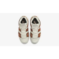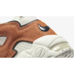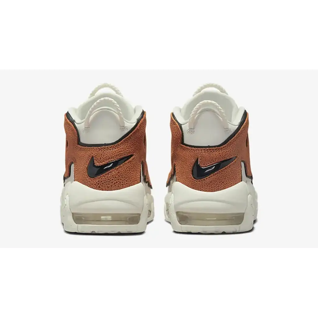 Meanwhile, large “AIR” letter patches on the side panels are dressed in a textured brown tumbled leather that’s reminiscent of a gritty basketball surface. Finally, classic Nike Air More Uptempo features such as lightweight Air bubble units and convenient loops are retained.