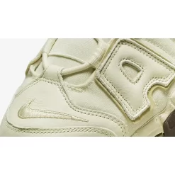 This Air More Uptempo has a creamy Coconut Milk canvas base matched by smooth and tumbled leather overlays on the toe. The large “AIR” badges on both the medial and lateral sides of the shoe are also Coconut Milk but with Team Gold leather outlines. The large Swoosh cutouts on the heel spines reveal Team Gold leather tooling underneath. The tongue, laces and plastic lace locks are all a cream colour. A cream-coloured midsole with exposed Air units from heel to toe and a speckled Gum Dark Brown rubber outsole complete the design of this shoe.
