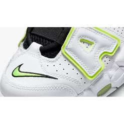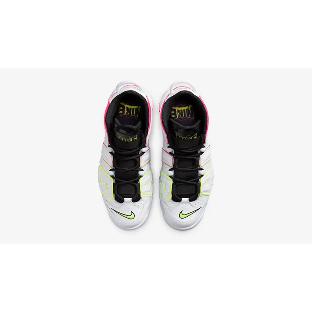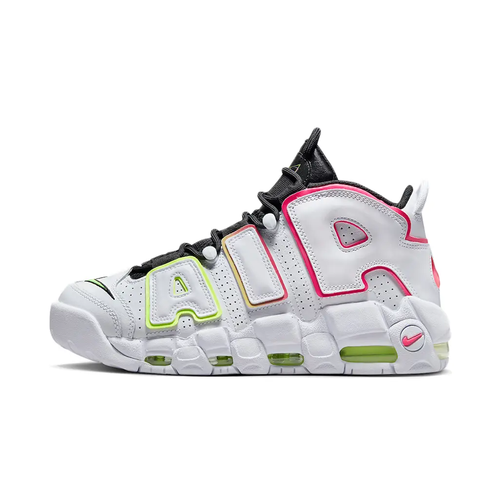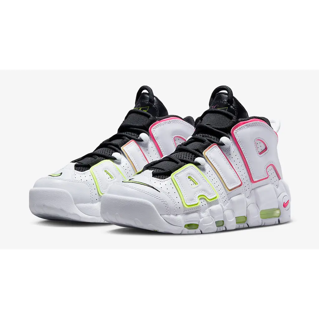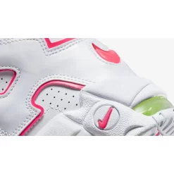 This Air More Uptempo has a pure white leather base with perforations. The tongue, mesh sock liner and laces are all in contrasting black. The iconic graffiti-like “AIR” overlays on both the medial and lateral mid-panels are white as well with outlines that display a neon-to-pink gradient aesthetic. The embroidered mini Swooshes on the toe boxes are Volt Green while the mini Swooshes on the heel panels and the jelly Swooshes on the heel spines are all in hot pink. An all-white sole unit with Volt Green-accented Air units completes the style of this sneaker.