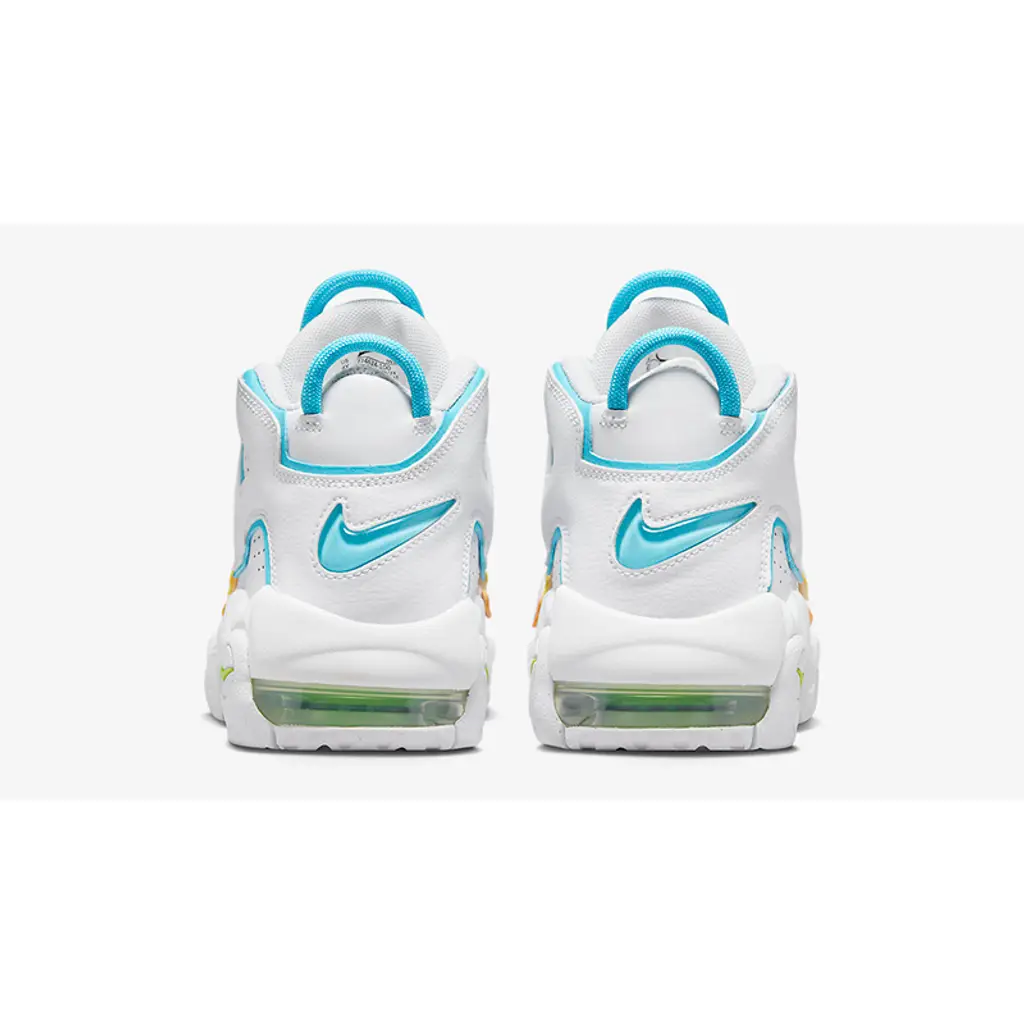This smaller-sized Air More Uptempo is predominantly a “colourless” white and accompanied by flashes of orange, yellow, blue and green. The oversized “AIR” patches on both the medial and lateral mid-panels are white with each outlined with a bright colour. A is paired with orange, I is paired with yellow, and R is accompanied by a bright blue. These summer colours repeat on the stretchy eye stay panel accents. The tongue pull tabs and heel pull tabs are also bright blue. A white sole unit with exposed Air bubbles at the heel round out the style of this sneaker.