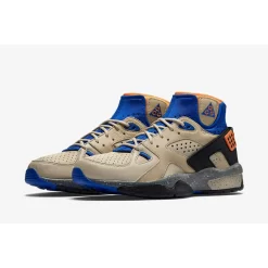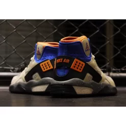The pair is highlighted in its OG colourway. It includes a light tan upper with a burst of colour along the ankle region. There is the iconic dark heel cage with blue and orange hints on the upper ankle region. The pair sits on top a speckled midsole with additional branding on the back heel strap. A dark outsole unit finishes off the overall outlook.