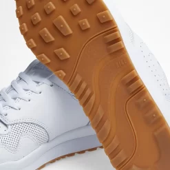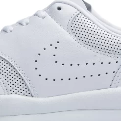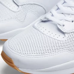 You can find a fully white upper that sits upon a gum sole. The Swoosh is perforated meaning no damage can occur and the upper is also made of leather making the durable to the elements.