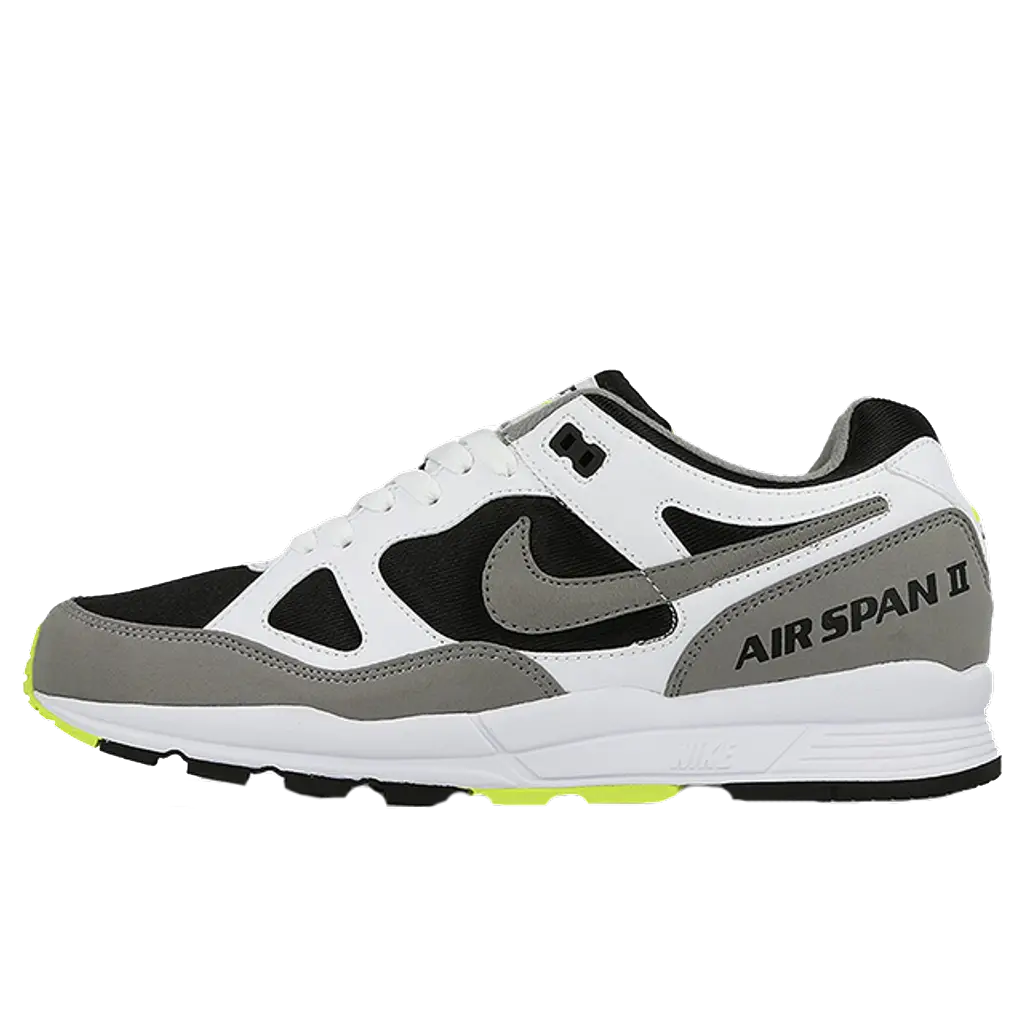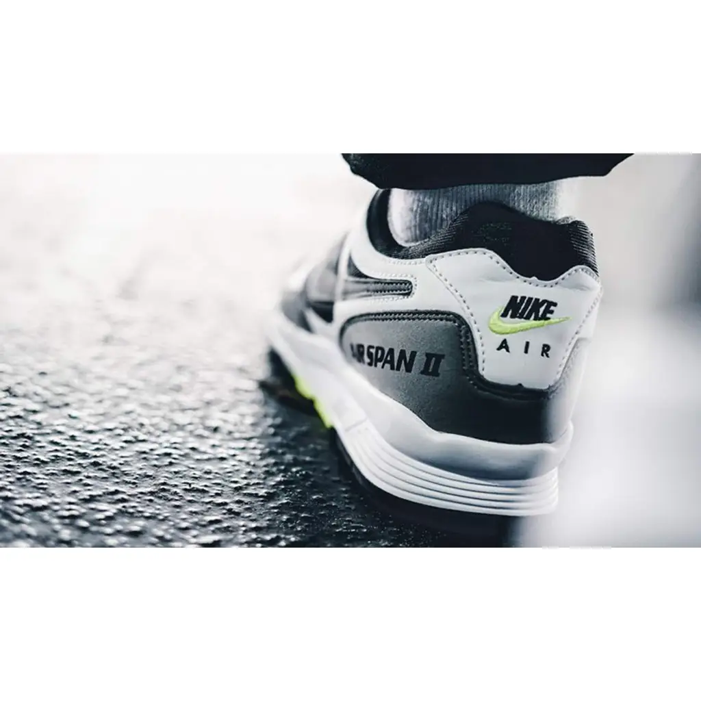 It’s the low profile look which makes this silhouette just as timeless as ever. The hits of dark grey are contrasted by the white leather panels. This ‘Grey White’ Air Max Span II is especially interesting thanks to the hits of volt which feature to the outsole underfoot. To complete the look, oversized “AIR SPAN II” branding is stamped to the heel.