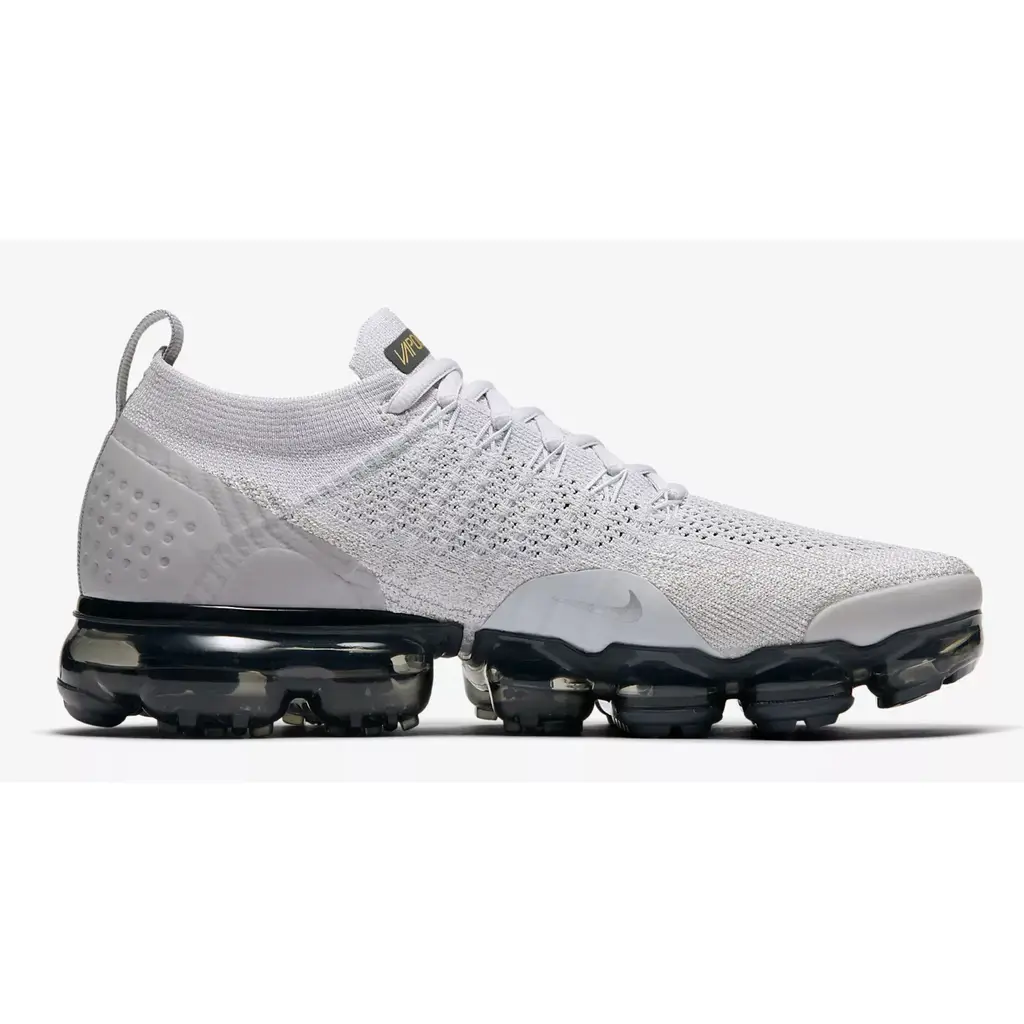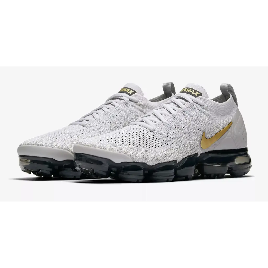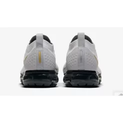 Breaking the grey tone are the gold and black accents. Golden detailing is featured on the side Swoosh, on one of the heel details, on the tongue tag and even on the lace ends, where metal VaporMax branding can be seen. A silver panel can also be seen on the alternate heel.