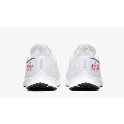 Purple Swooshes adorn the sidewalls of the Nike Air Zoom Pegasus 36 White Purple, in a completely oversized style that stretches all the way down to the toe box and all the way back to the heel, where Nike branding in hot pink adds an extra feminine touch.