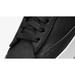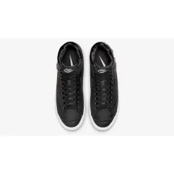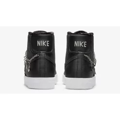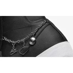 The upper of this pair is in all-black smooth leather from heel to toe and from base to overlays, including the laces and the signature profile Swooshes. The tongue and lush velour sock liner follow suit. Nike branding in silver is featured on the black tongue tab as well as the heel tab. The unique detail on this shoe is the silver charm bracelet on the ankle showing off the Nike Swoosh, the Nike Blazer Mid sneaker, and the vintage ’77 number that’s associated with the Nike Blazer.