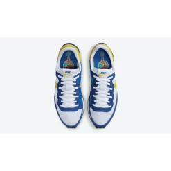 Dressed in a color-blocked blue, white and yellow look, the uppers are crafted from a blend of suede, mesh and synthetics for an old-school running look. Nike’s signature Swoosh logo runs across each side in yellow pebbled leather for an eye-catching branded touch, while additional typeface logos remain at the heel tabs.