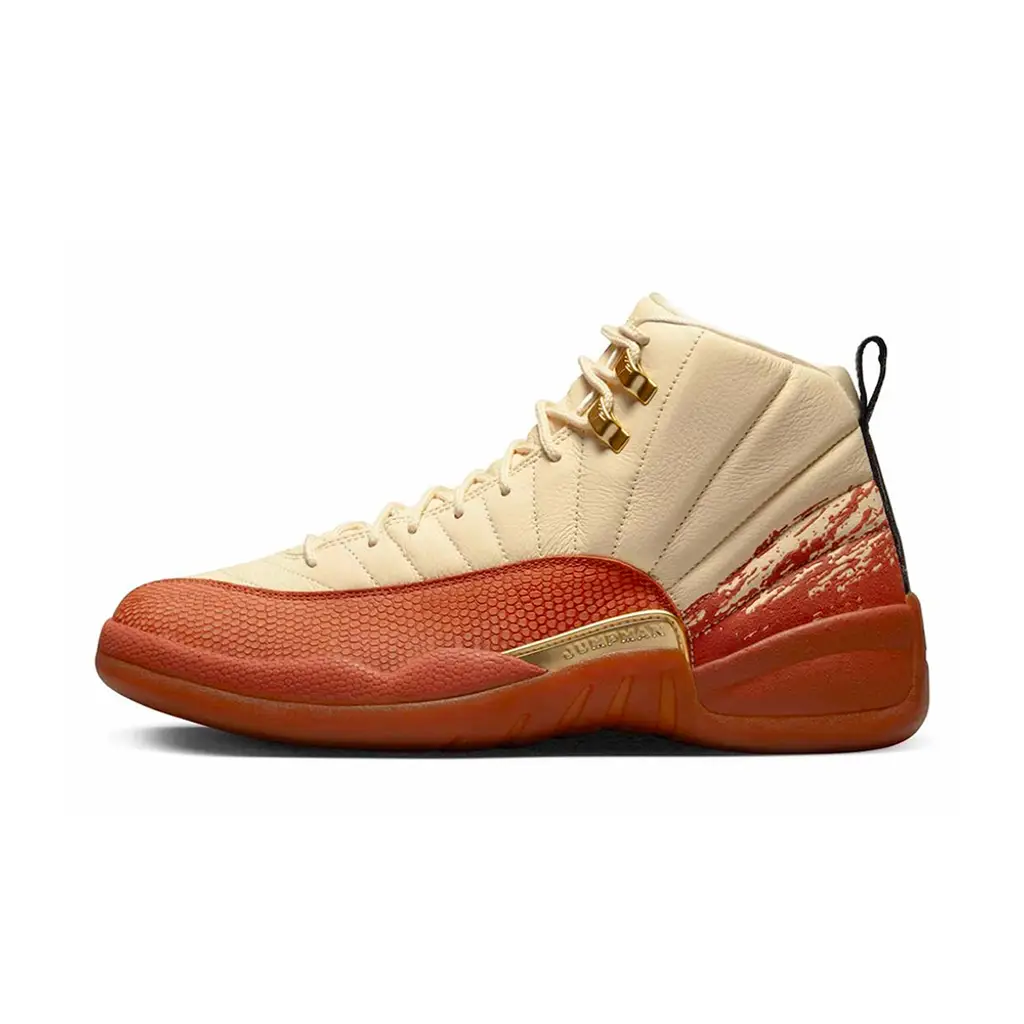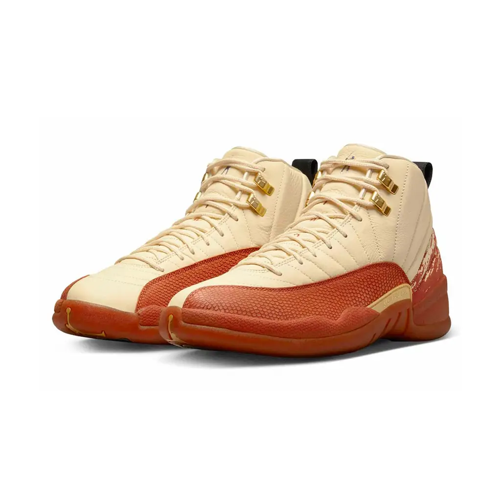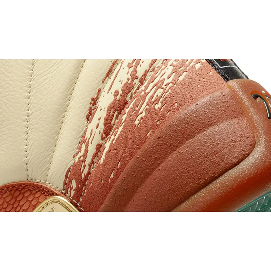A splash of terracotta red comes in via the splattered design at the backside and through the mudguard with a snakeskin-like pattern. Underfoot, the lightweight sole unit is dressed in the same bold hue for visual unity. Red and green insoles and a black pull tab finish off this collaborative Air Jordan 12.