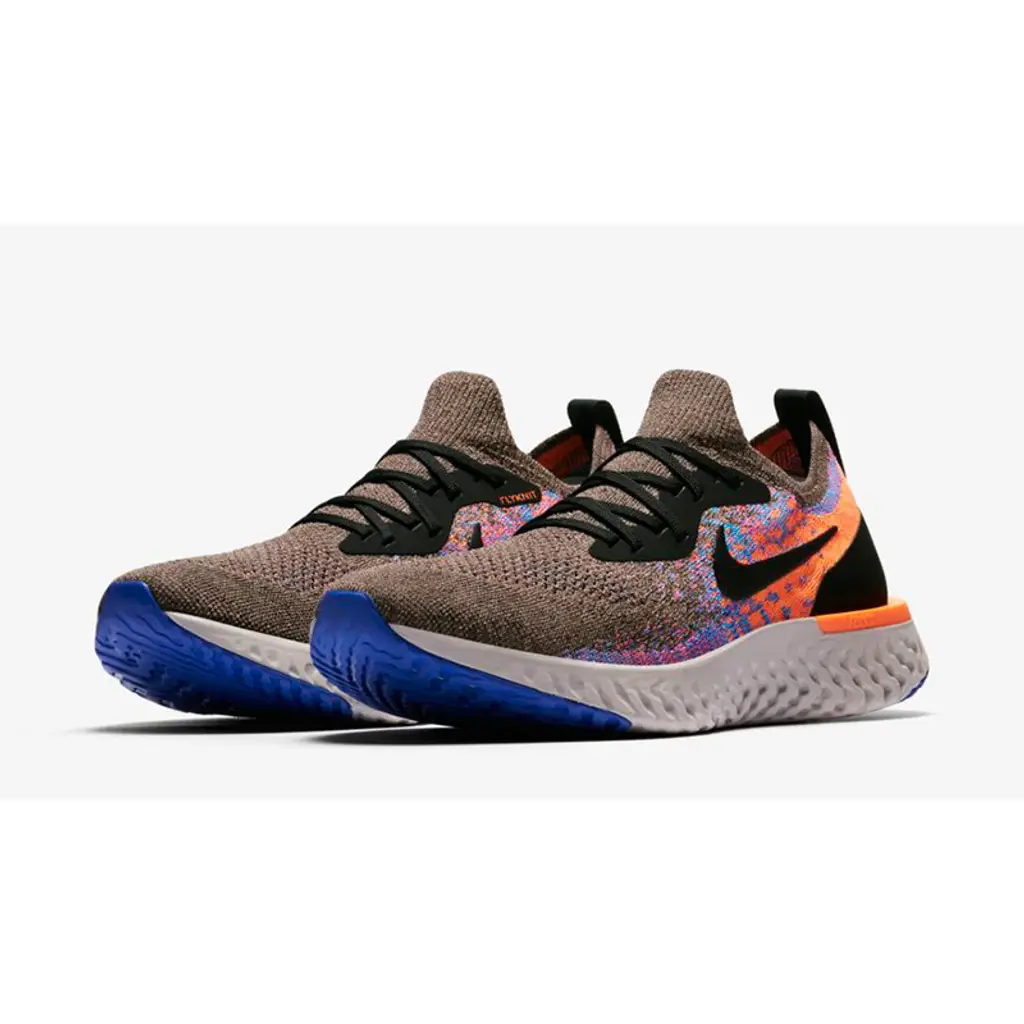 Designed to completely dominate the track, the Epic React Flyknit Brown Orange features an ultra colourful Flyknit upper for optimum versatility, and an off-white React foam midsole down below for additional comfort and a smoother stride. A contrasting black heel cup is present for extra support, whilst a Swoosh features for that unmistakably Nike aesthetic. To round it all off, a dash of dark blue can be seen on the outsole for an even more eye-catching vibe.