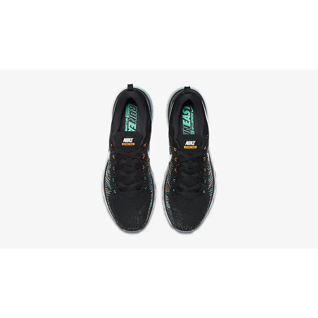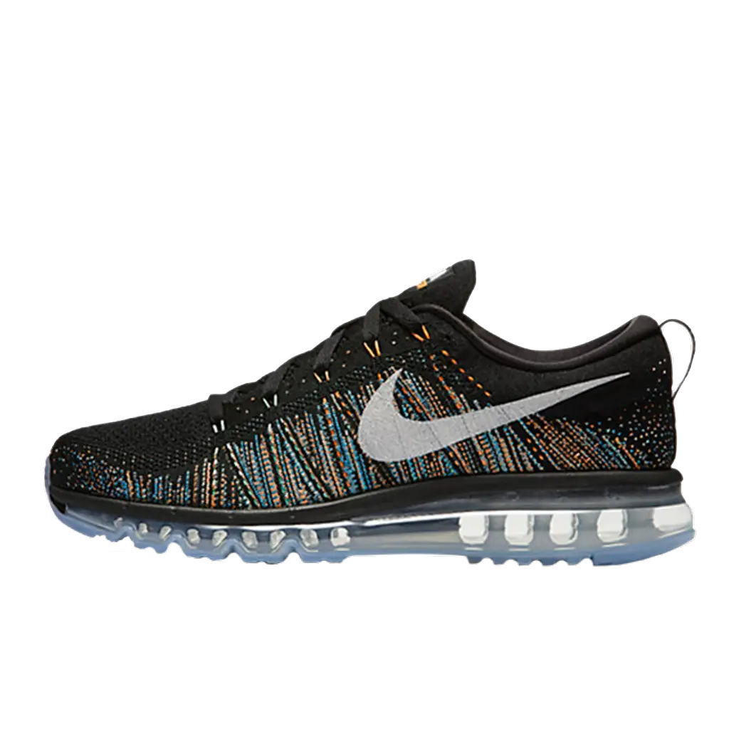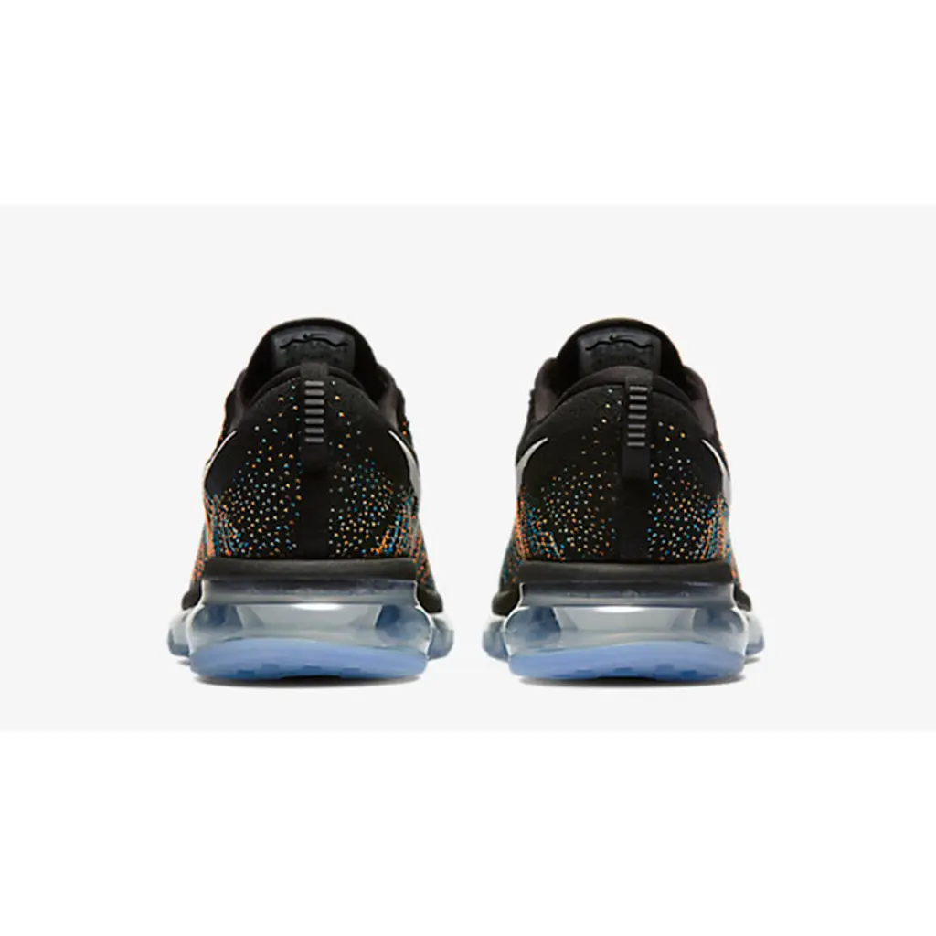 Nike’s trademarked Flyknit is utilised for the upper. Unlike earlier models which showcase a simplistic design, this pair features a colourful kaleidoscope with blues and oranges hitting the sidewall. It gives a nice gradient affect which looks especially eye catching against an all black base.