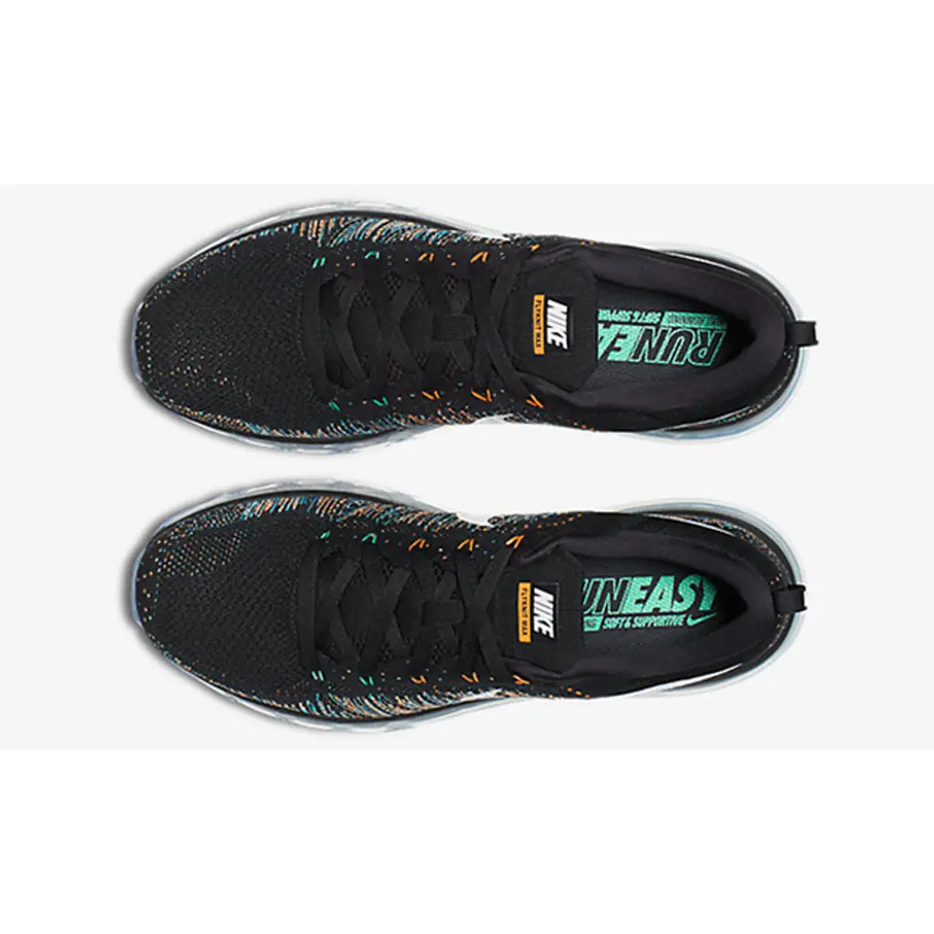 Soft and flexible Flyknit hits the upper for an ultra lightweight design that contours to the shape of your foot. A predominantly black base features subtle hits of colour with vibrant oranges and blues fusing against that woven construct.