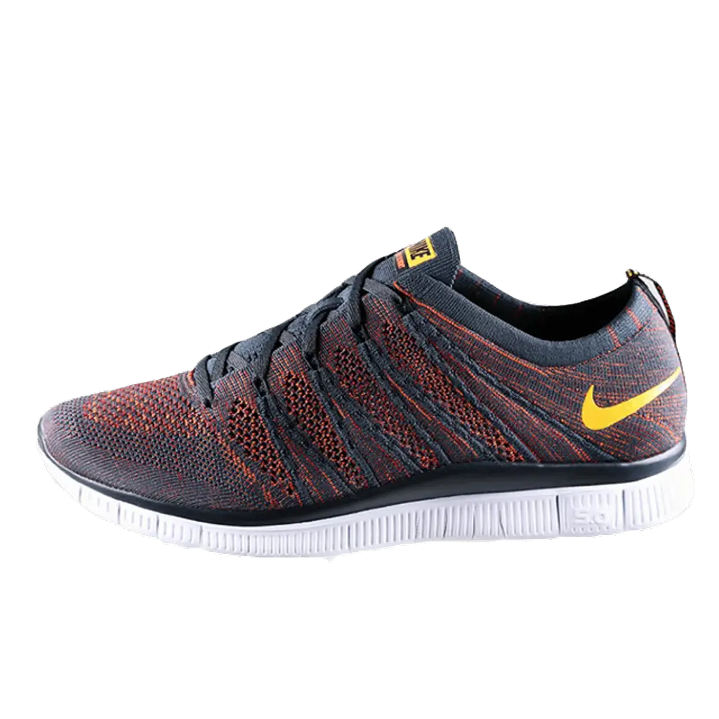 The pair is highlighted in an Anthracite and Laser Orange fused colourway. It features the innovative Flyknit technology utilised uppers, which provides support and sturdiness while being lightweight. The pair sits on top of a 5.0 Free outsole unit in White and the entire upper is featured in anthracite and laser orange combined colourway. There is eye-catching black detailing on the interior and laces. The pair has branding in yellow on the tongue with a white small Nike swoosh on the heel region. It is finished off with a white outsole unit.