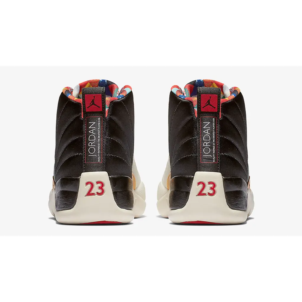 Made to celebrate the ‘Year of the Pig’, the Jordan 12 Chinese New Year Black is dressed in a luxe black satin upper with a textured white leather overlay and metallic gold detailing throughout, presenting an aesthetic that can be compared to the Jordan 12 ‘Wings’. For additional CNY vibes, an eye catching multicoloured sockliner features, and a special embellishment on the left shoe’s tongue replaces the standard Jumpman logo.