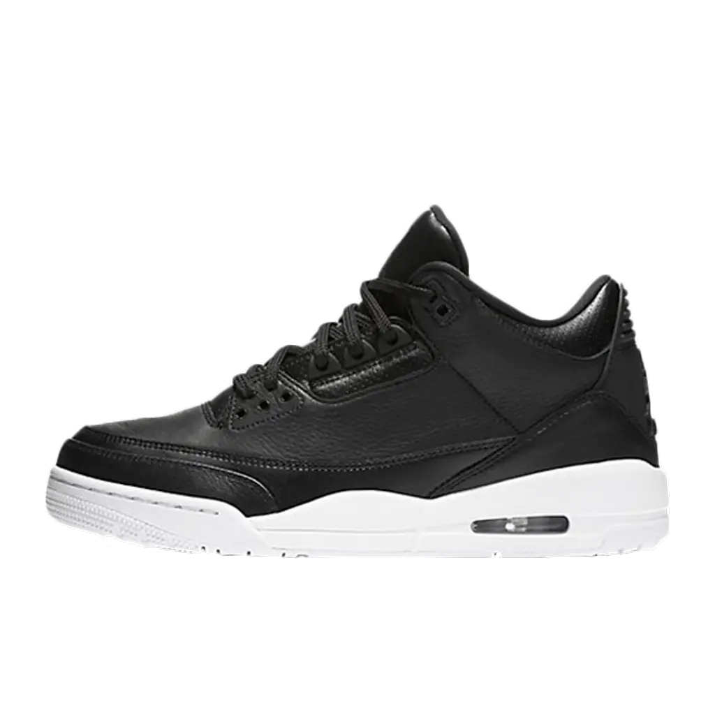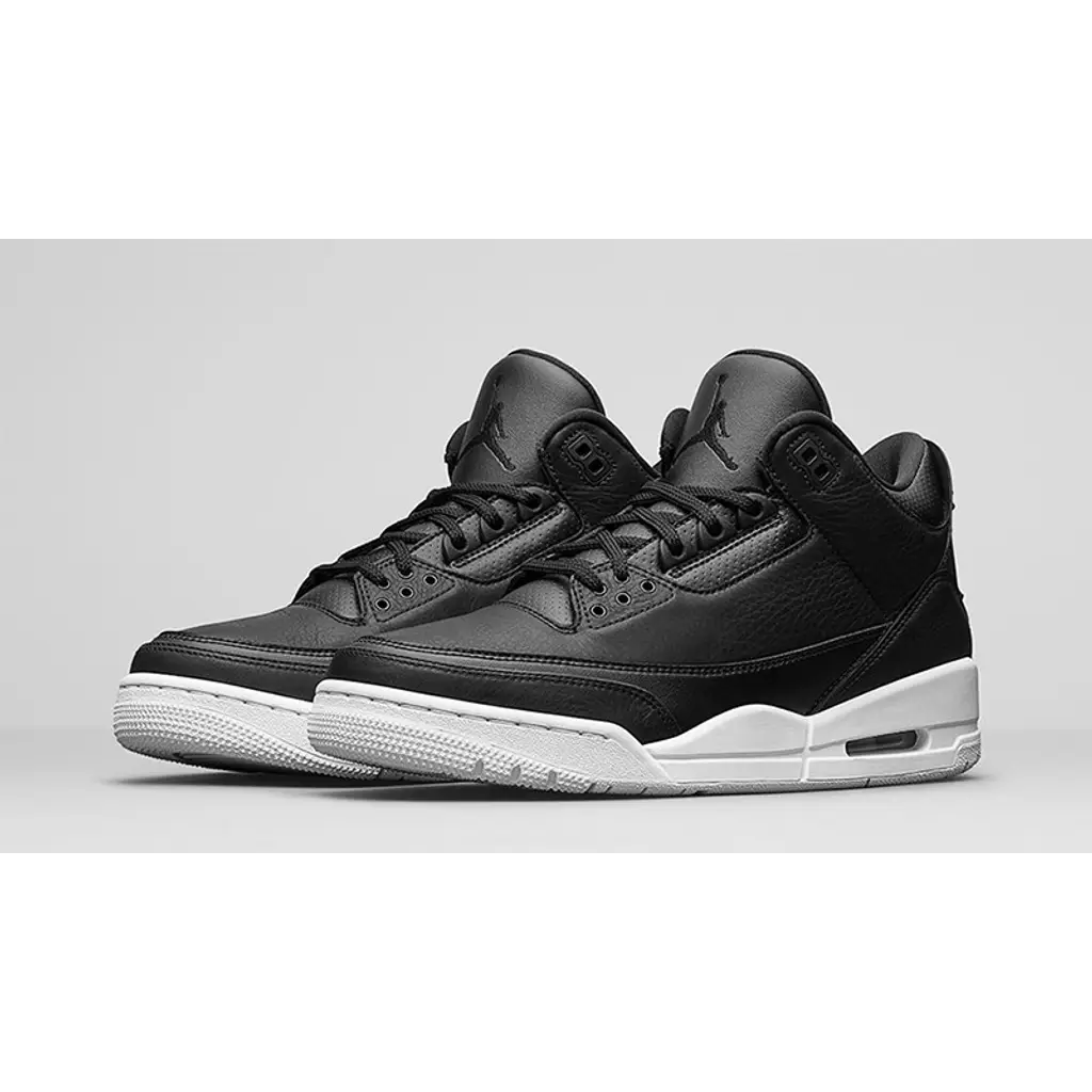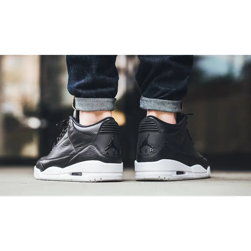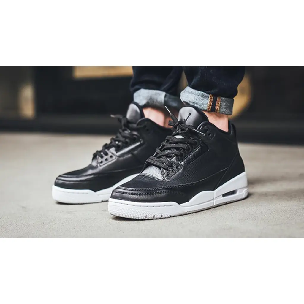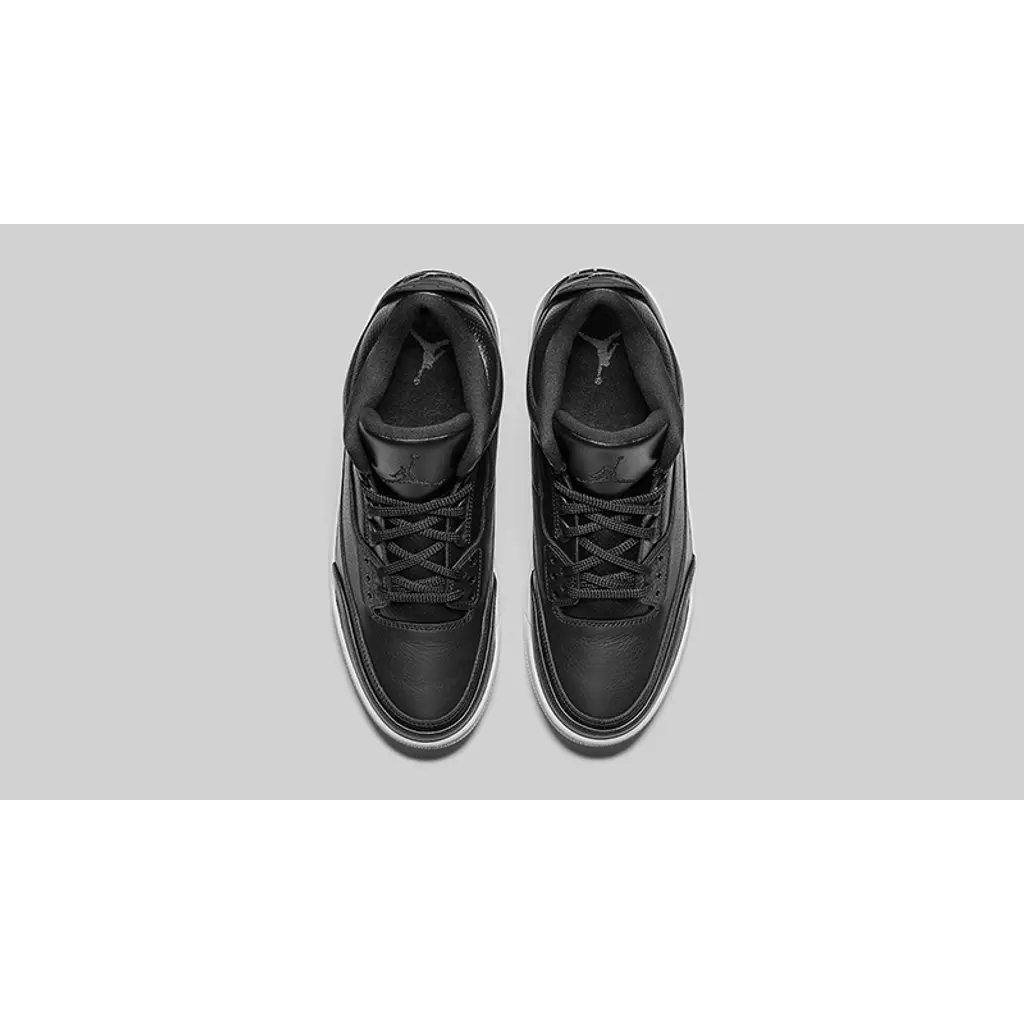 To contrast that full black upper, the shoe sits on a white midsole complete with a visible Air Unit. A synthetic overlay is stamped to the heel for additional protection while giving that customary AJ3 aesthetic. This also features a tonal coloured Jumpman.