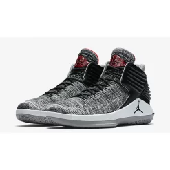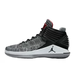 True to that original release, this Jordan 32 arrives in the same sleek mix of black, white and red. Clearly, it’s far more contemporary than anything released in the late 80s. Soft Flyknit covers the upper, extending high across the ankle and promising that foot-hugging support.
