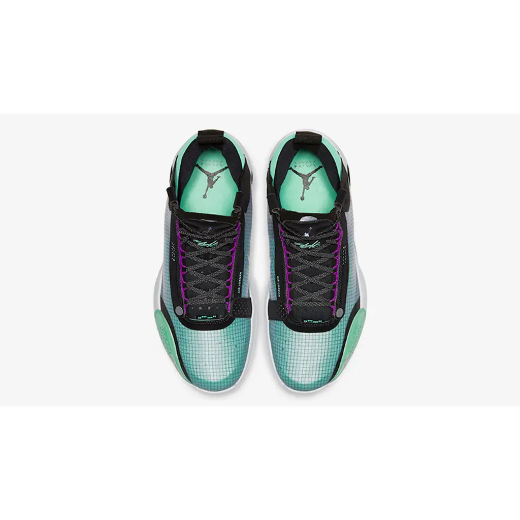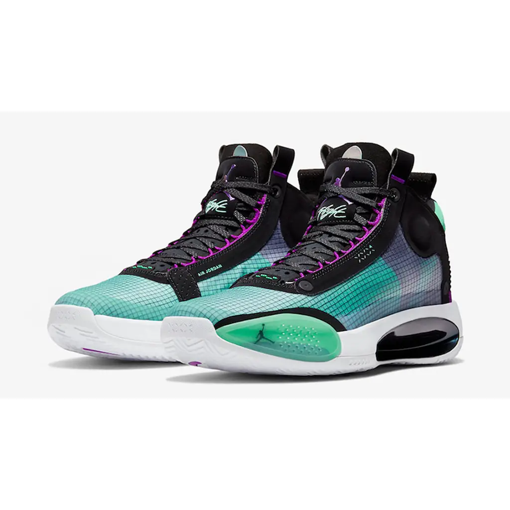 One of the first AJ34 colourways to release since the silhouette was introduced in September, the upper is painted in a teal and purple colour scheme with stealthy black accents making its way to the lacing system and heel. Crafted from a see through textile that’s similar to the React Element 87 and the Zoom Fly, you’ll also find a Zoom Air unit at the forefoot that’s paired with two Pebax pieces for comfort like nothing else out there.