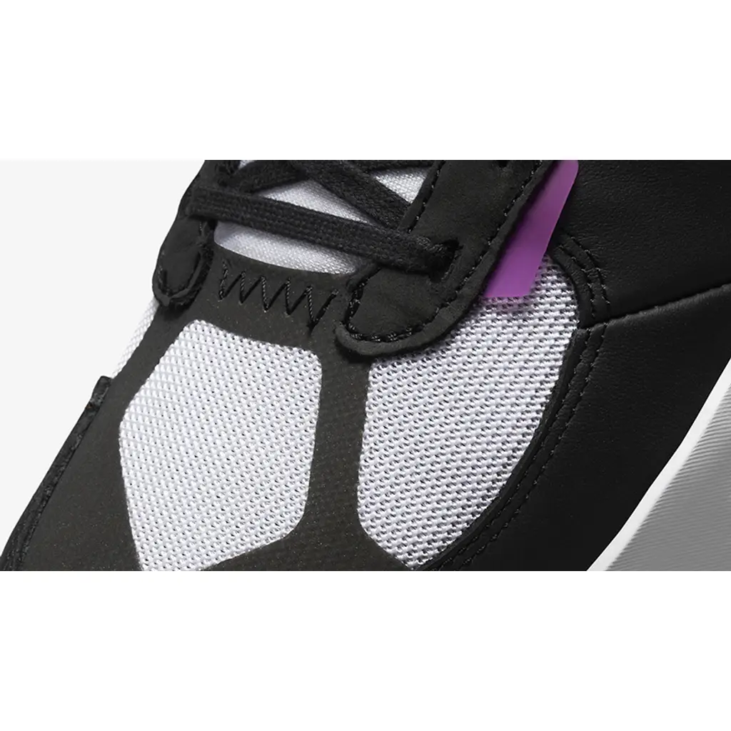 This Air 200E has a light grey mesh base with black geometric decal accents. The leather overlays on the toe cap, the mudguard and the heel panel are all pitch-black. This colour repeats on the mesh sock liner and the suede eyelets.
