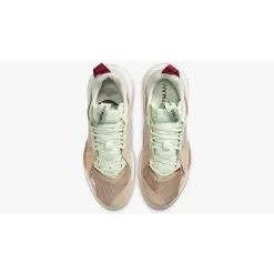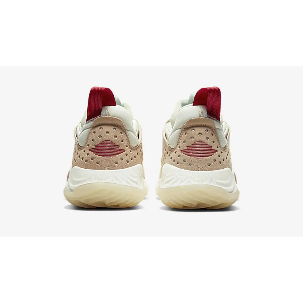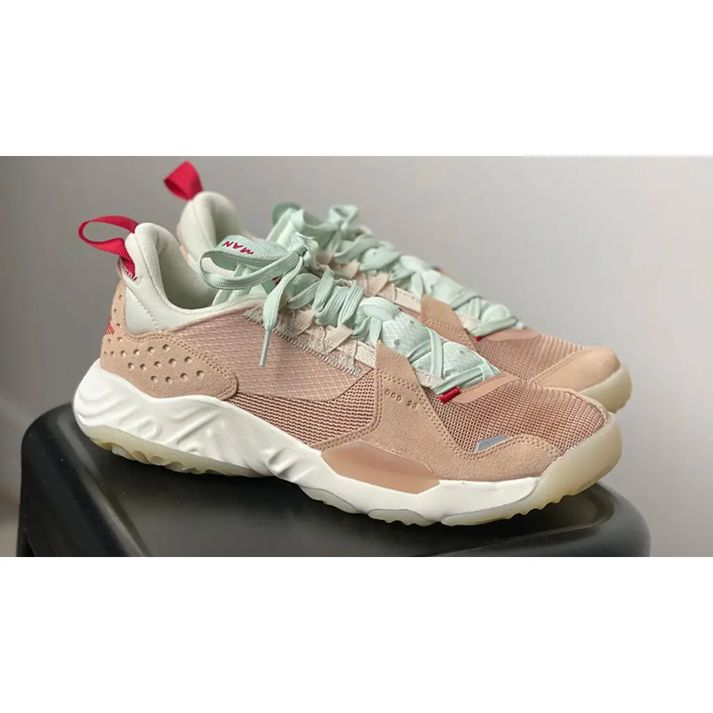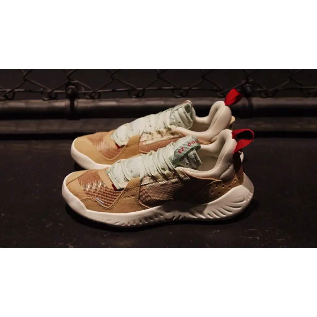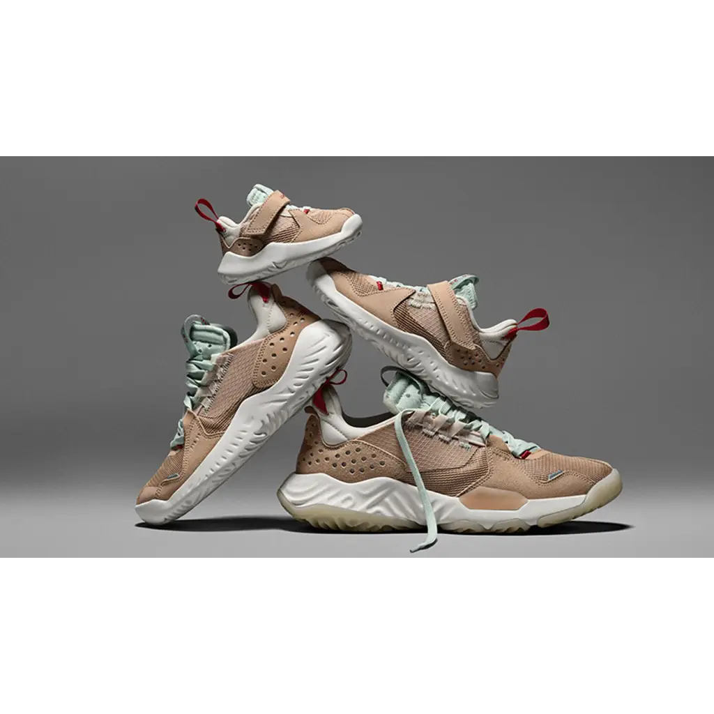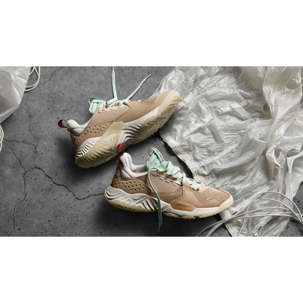 The uppers are crafted from a technical blend of suede, mesh and synthetics to form an evenly textured appearance and take on a clean natural-hued colourway titled Vachetta Tan. Jordan branding is kept to a minimum, with only a typeface logo present across the tongue. The ultra cushioned ankle unit is decked out in white, with red details complementing the otherwise subtle look. Mint-green accents run down the tongue and lacing system also.