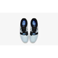 A light shade of blue covers almost the entire upper with the exception of black markings to the sidewall Swoosh, tongue and laces. A rubber strap keeps the foot locked in place, featuring a Nike logo in a vibrant shade of blue. To complete the look, perforations are marked across the toe box.