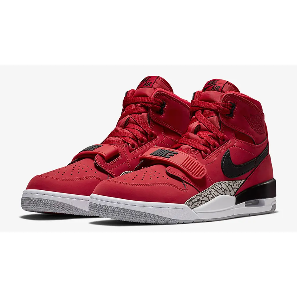 Premium leather covers the upper of the Jordan Legacy 312 Red White. As with the previous Don C exclusives, this pair is outfitted with a chunky strap that keeps the foot securely locked in place. This comes embellished with Nike branding.