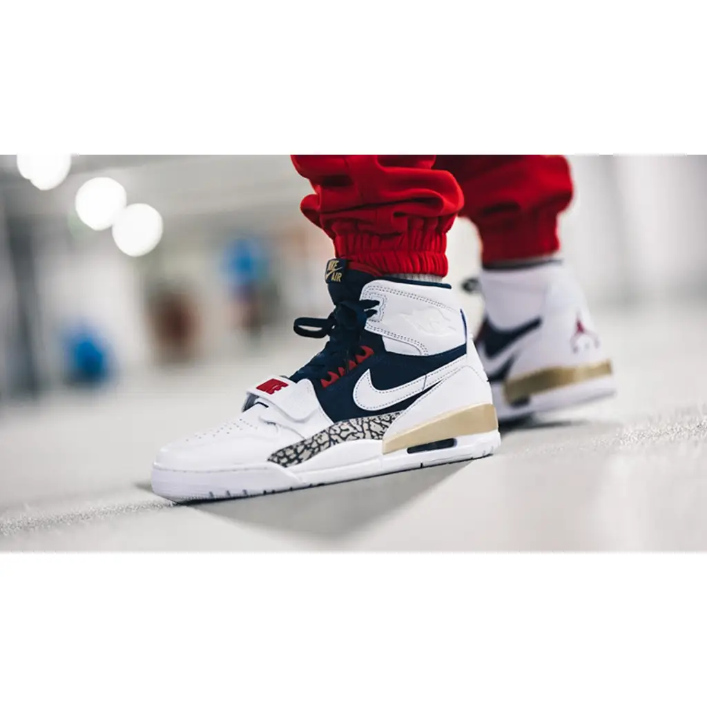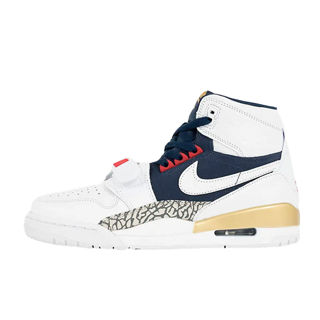A hybrid between the Jordan 1, Jordan 3, and Alpha Force Low, the Jordan Legacy 312 White Midnight Navy Varsity Red drops in a ‘Dream Team’-like palette, paying homage to the legendary USA basketball team that captured the hearts and minds of the world on their way to a gold medal during the 1992 Olympic Games. Crafted from white leather and dark blue suede, varsity red accents offer Olympic contrast, while the model’s signature elephant print graces the mudguard.