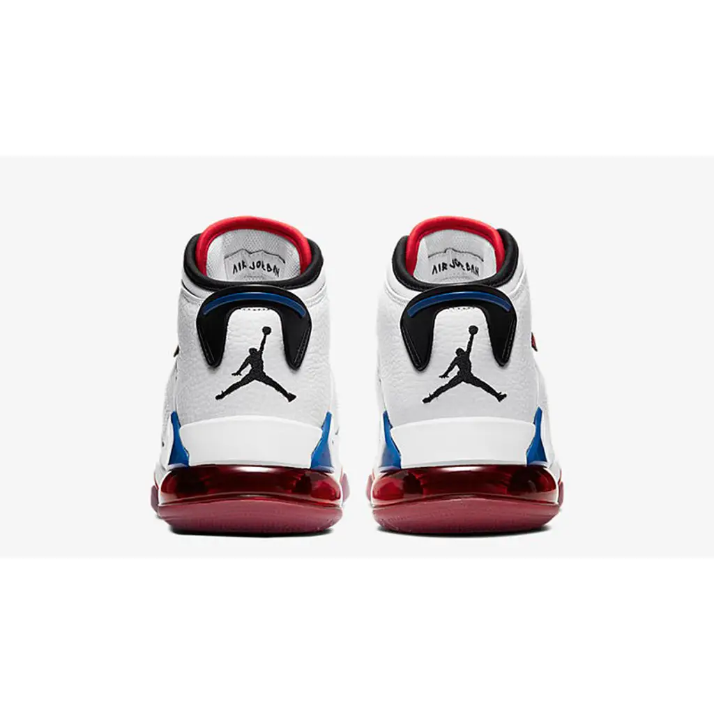Painted in a somewhat patriotic red, white, and blue colour scheme, this JM270 is made from soft pebbled leather throughout. A see through mesh panel at the lateral and medial sides mimic the AJ5, and the rubberised pull tab at the heel is clearly inspired by the AJ6.