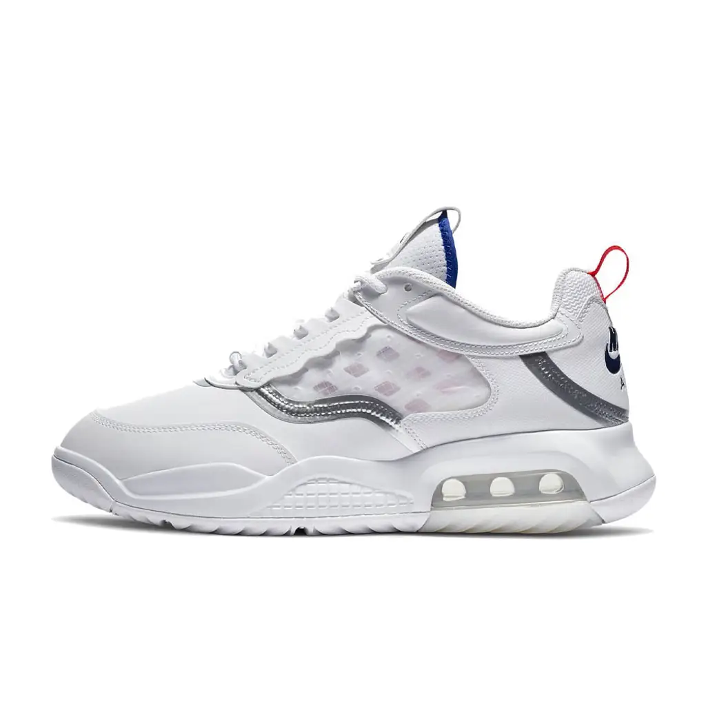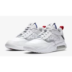 Dressed in a clean triple white version with red accents, the uppers are crafted from a neat blend of leathers, mesh, and synthetic to form the ultra-modern look. Branding comes in the form of a Jumpman logo at the tongue and Nike Air at the heel, honouring the impressive history that Jordan Brand holds.