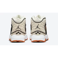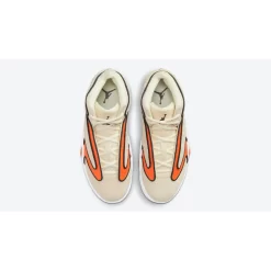Coconut Milk dresses the thick laces, while branding can be spotted on the tongue and the heel area via a black Jumpman logo. Beneath, a chunky white midsole comes paired with a vibrant orange outsole, to match that previously mentioned basketball leather.