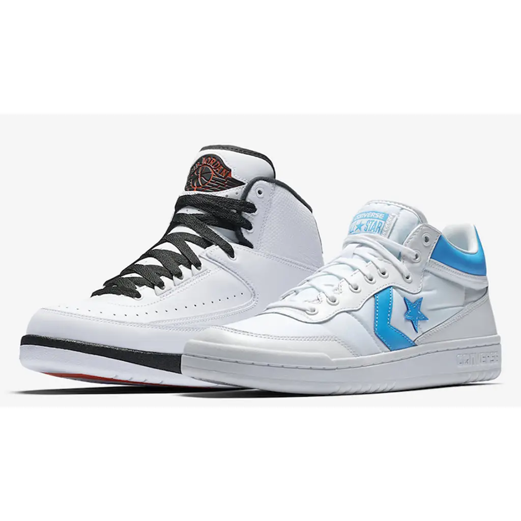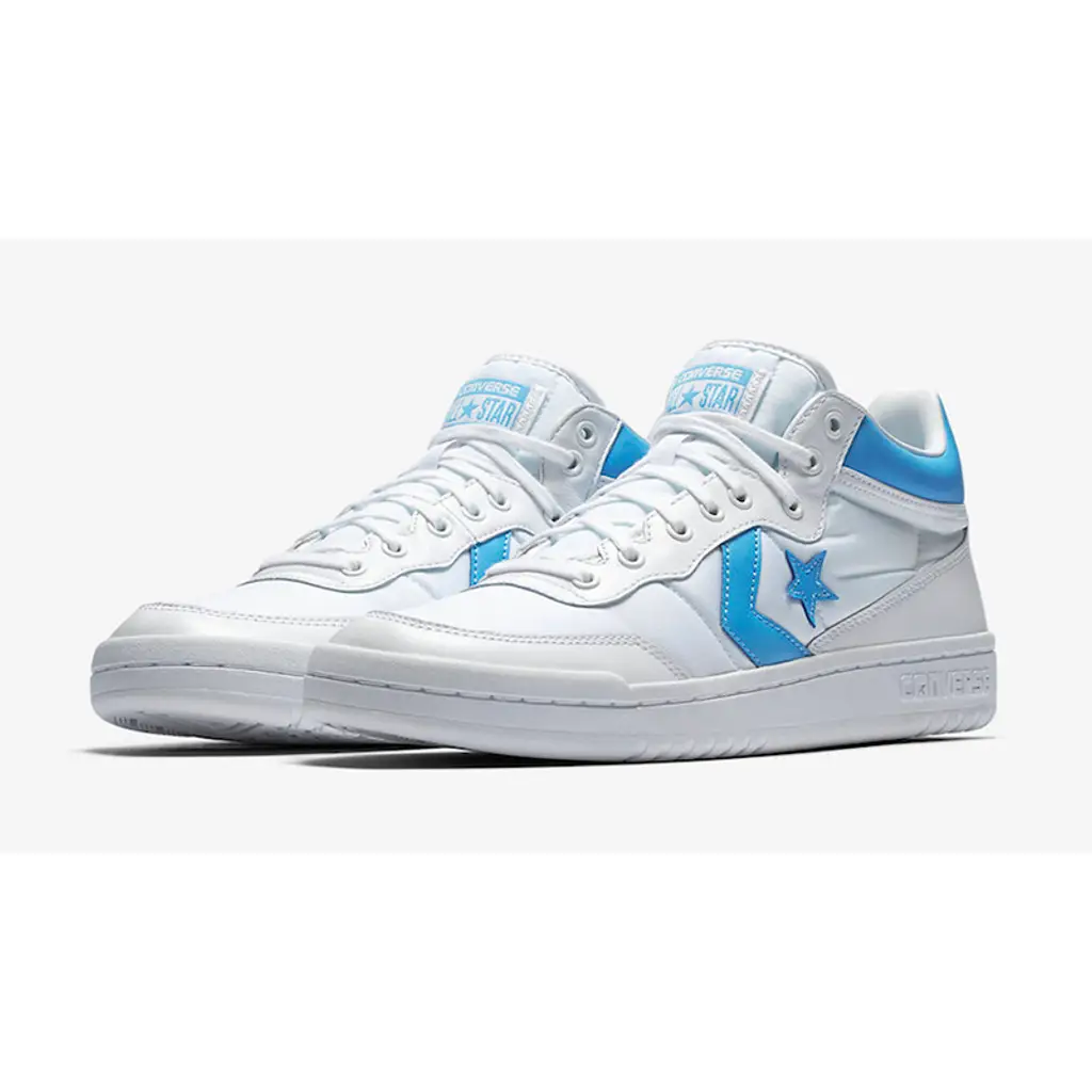 The first arrives in the form of the Converse Fastbreak – a vintage inspired shoe worn by Michael Jordan when he first appeared on the professional circuit. Taking to the hardwood in 1985, his record shattering career continues to impact the game long after his retirement. This blue and white Converse opts for a simple construct with a nylon and leather crafted upper.
