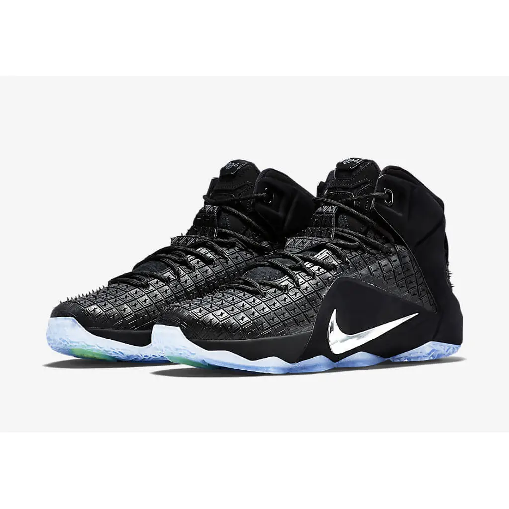 The shoes feature an all black base hitting the Hyperposite overlay. Instead of the traditional Megafuse upper used on previous LeBron 12 releases, this version is equipped with a stunning design resembling the surface of tires. The shoe has Chrome Nike Swooshes on the sidewalls which represent tire rims. There are more Chrome hits on the lace tips and the heel region. The pair is completed with an icy translucent outsole unit.