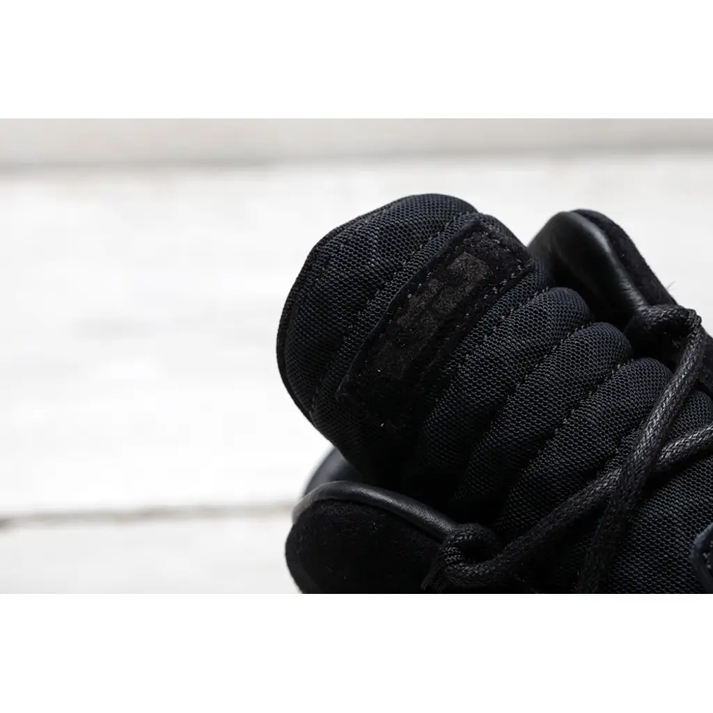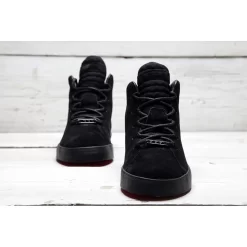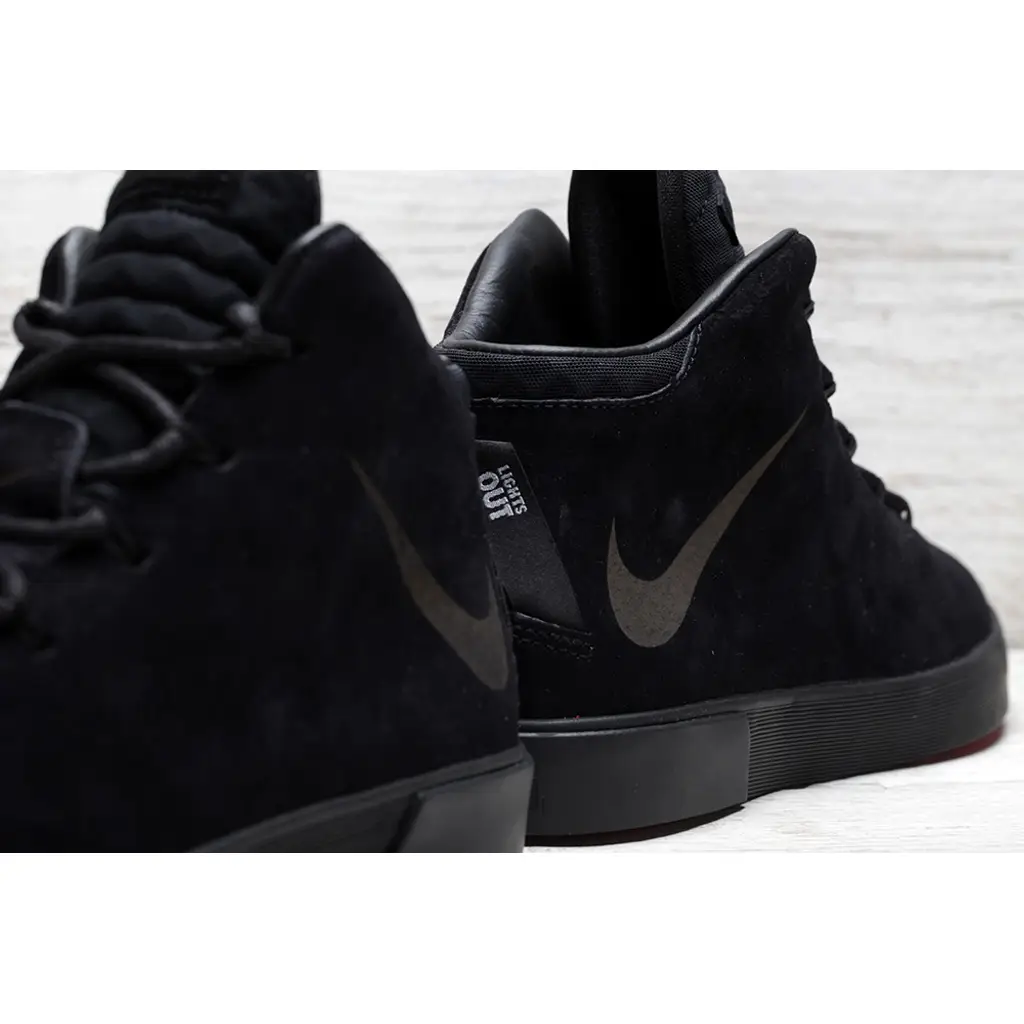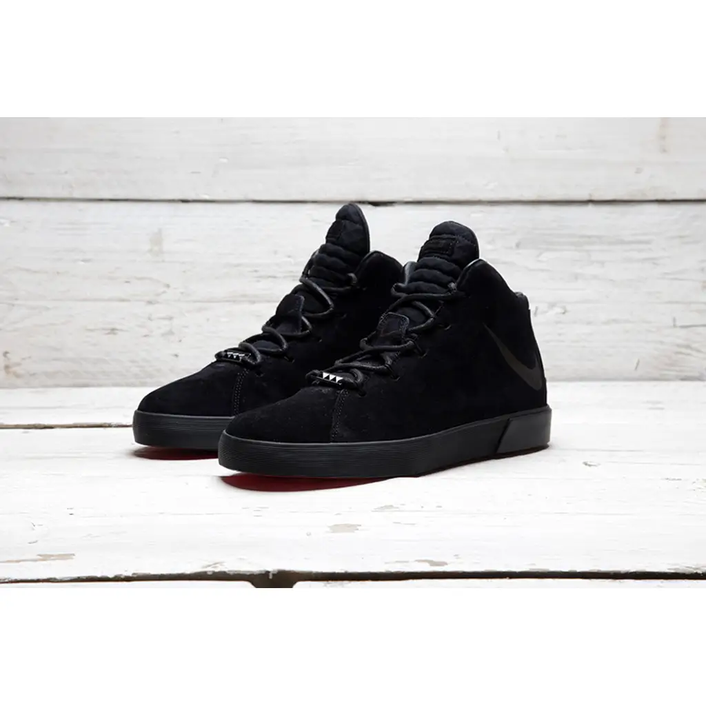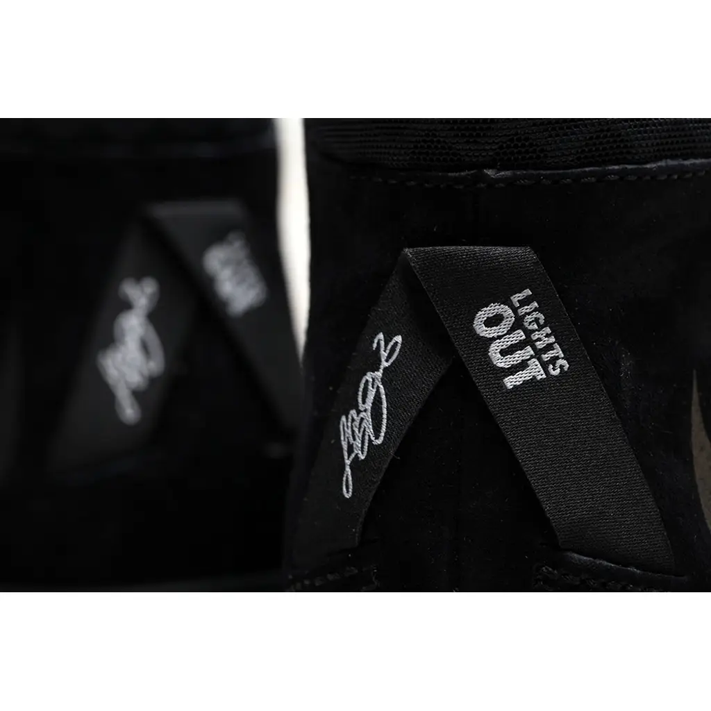 The upper is crafted with an all over suede. The suede covers both the toe-box & sidewalls. The tongue and heel panel are crafted with a mesh material. This all black colourway gives this lifestyle shoe a stealth look. The shoe is finished with a heel pull with LeBrons signature, lion crest and the quote ‘Lights Out’.