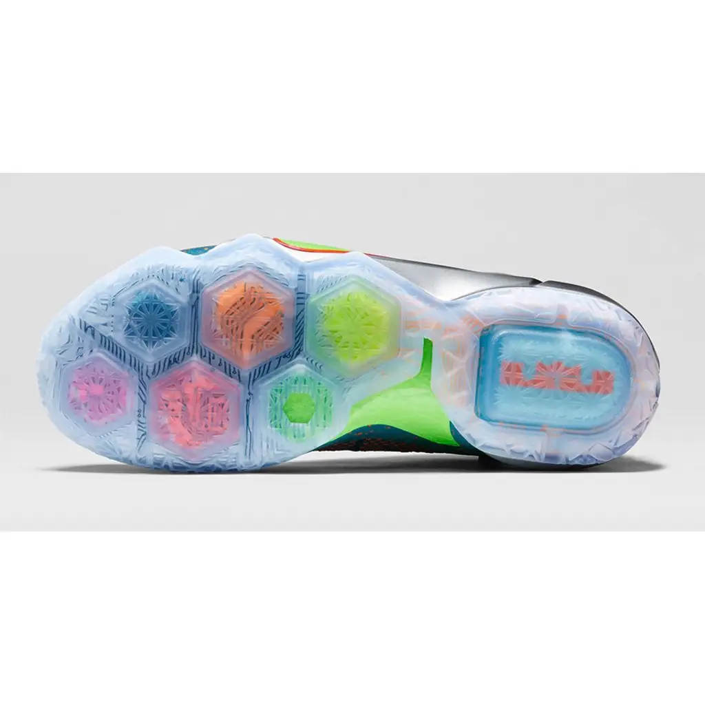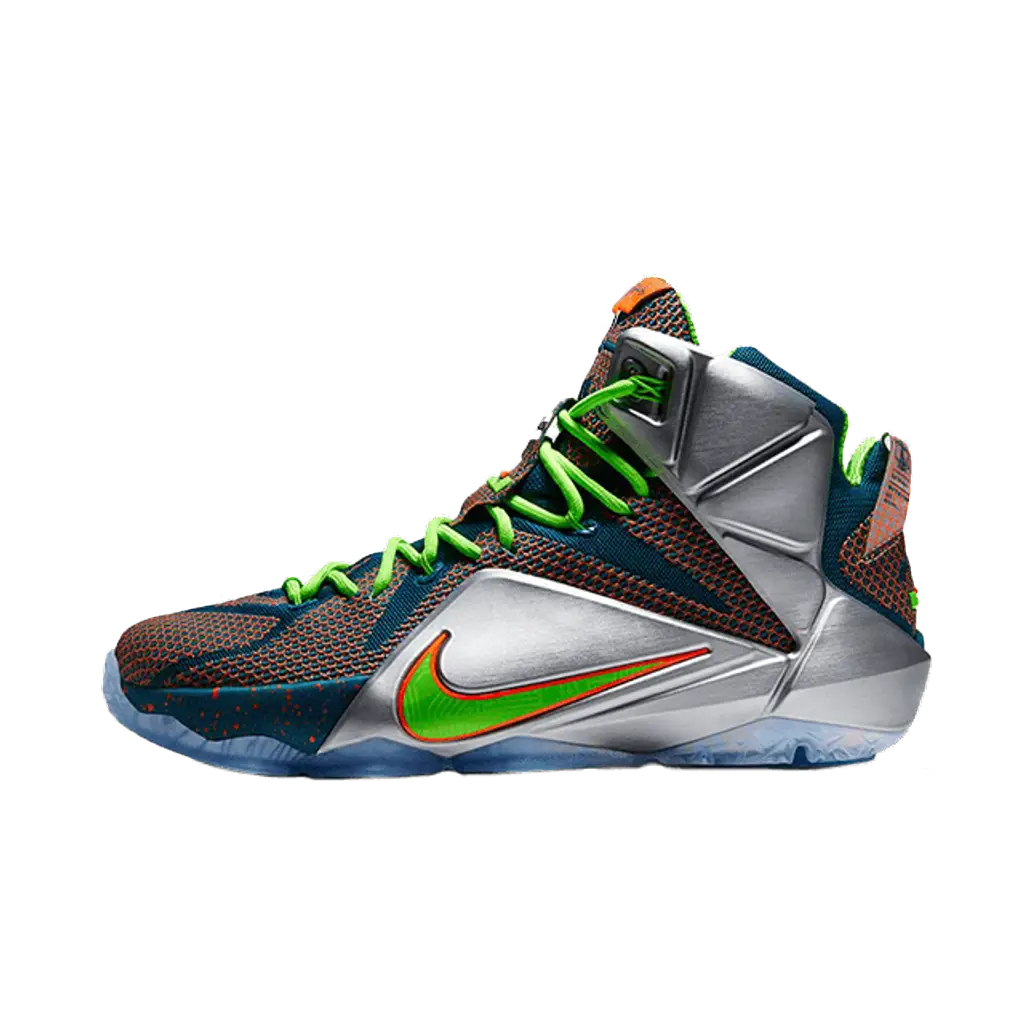 The pair of Nike LeBron 12 is featured in a blend of blue and green combined colourway throughout the upper. The upper is highlighted with bright orange and bright green accents on the body. The pair includes a silver Hyperposite overlay, which takes care of the bright colours featured throughout this model.It is finished with an icy translucent outsole.